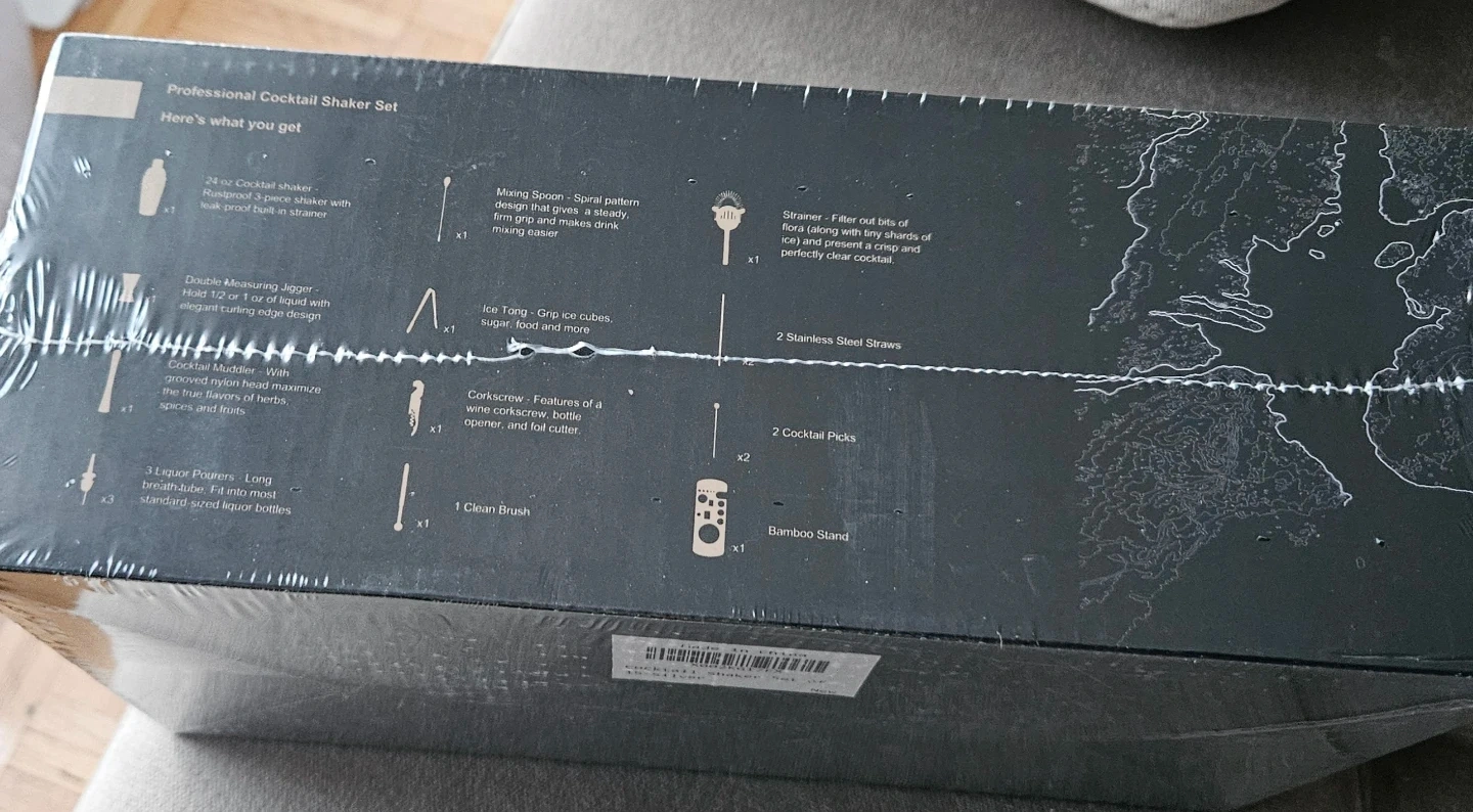 10I'm selling a brand new Kiessennsu Professional Cocktail Shaker Set, still sealed in its original packaging! This set includes everything you need to create amazing cocktails: - 24 oz cocktail shaker with a built-in strainer - Double measuring jigger - Cocktail muddler - 3 liquor pourers - Mixing spoon with a spiral design - Strainer - Ice tongs - Corkscrew - Clean brush - 2 stainless steel straws - 2 cocktail picks - Bamboo stand It's the perfect gift for any cocktail enthusiast or a great addition to your home bar