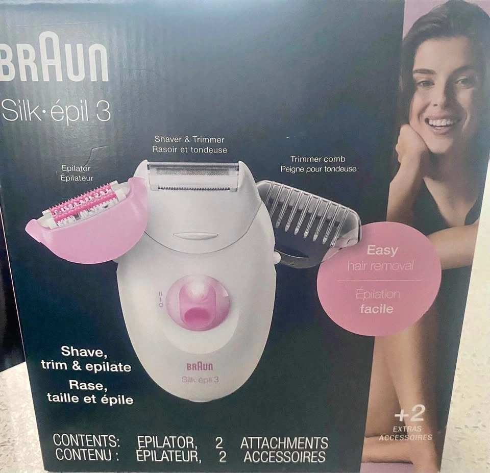 Brand new Braun epilator with attachments! Has shaver, trimmer, and epilator functions. Comes with 2 attachments and extras. Still sealed in original packaging.