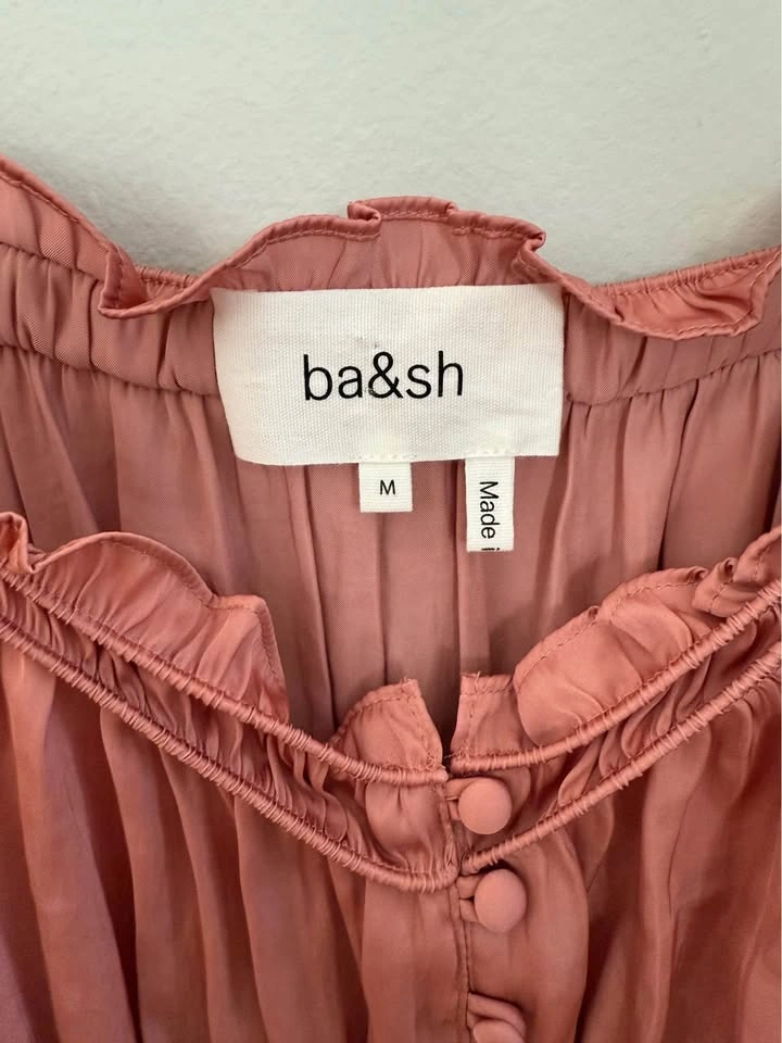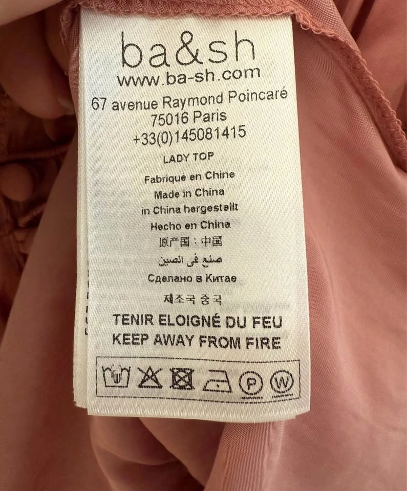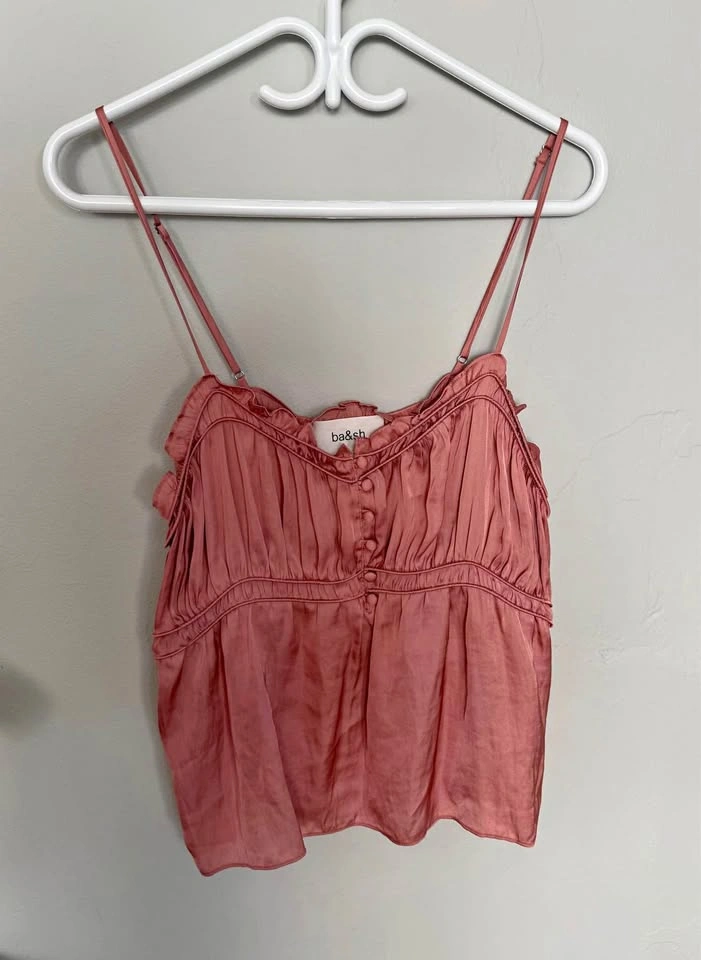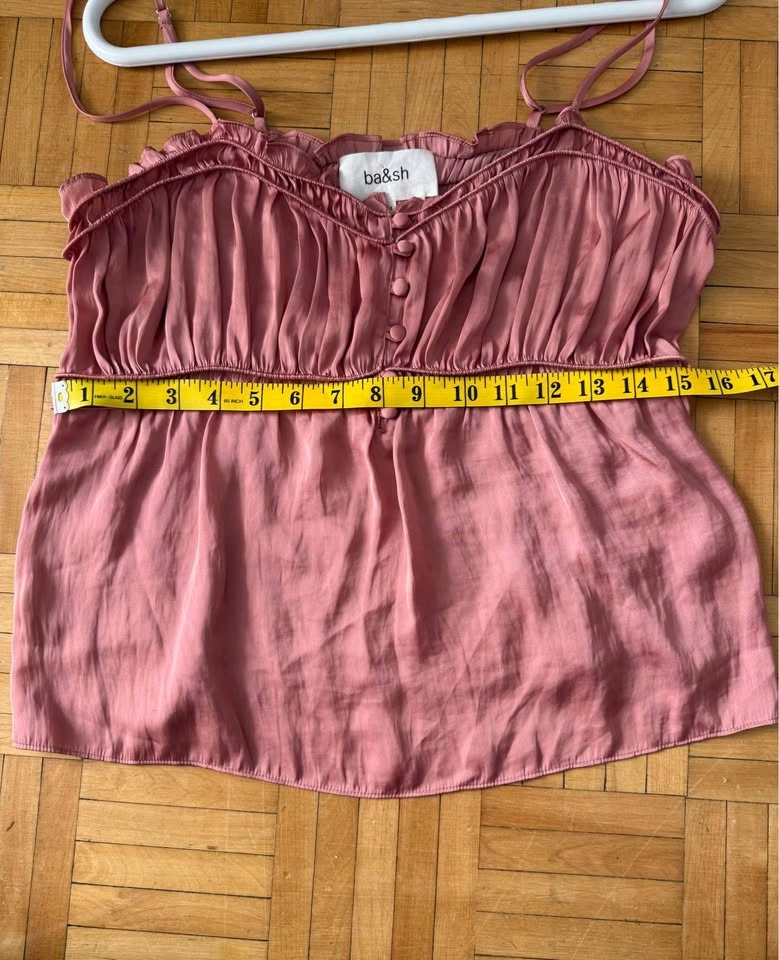 This top echoes pretty lingerie. This camisole has adjustable shoestring straps and an elastic pattern on the top which gathers above and below the bust. In satiny, slightly shiny fabric, it is finished with a short frill around the neckline and the button placket with covered buttons.
