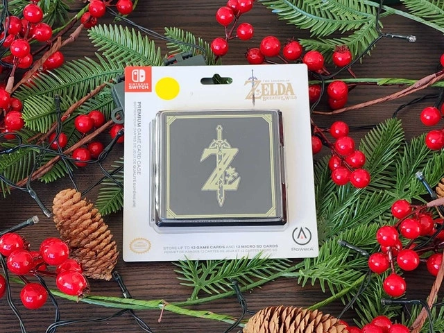 Featuring the Z Logo, this Zelda: Breath of the Wild Premium Game Card Case stores up to 12 Nintendo Switch game cards and 12 micro SD cards. The compact case is durable and easy to take on-the-go. Form-fitting rubber slots keep cards in place and a snap-closure keeps everything secure.