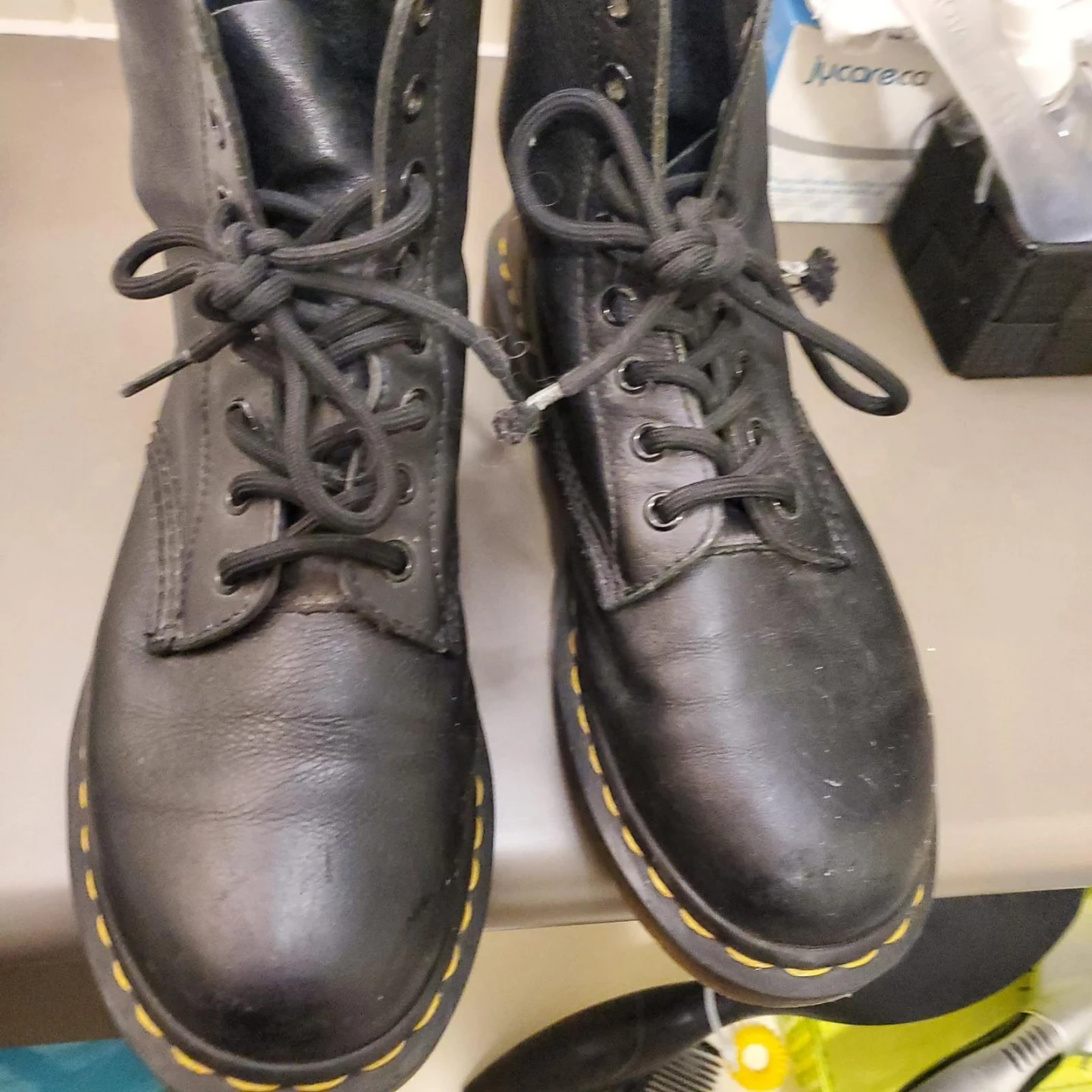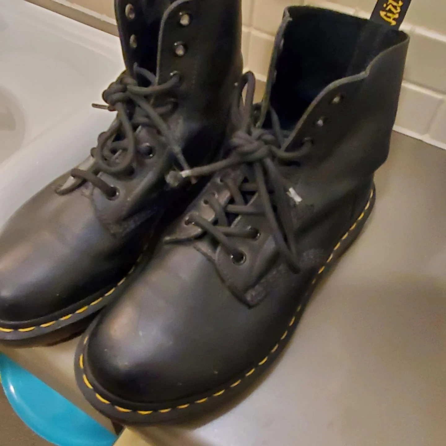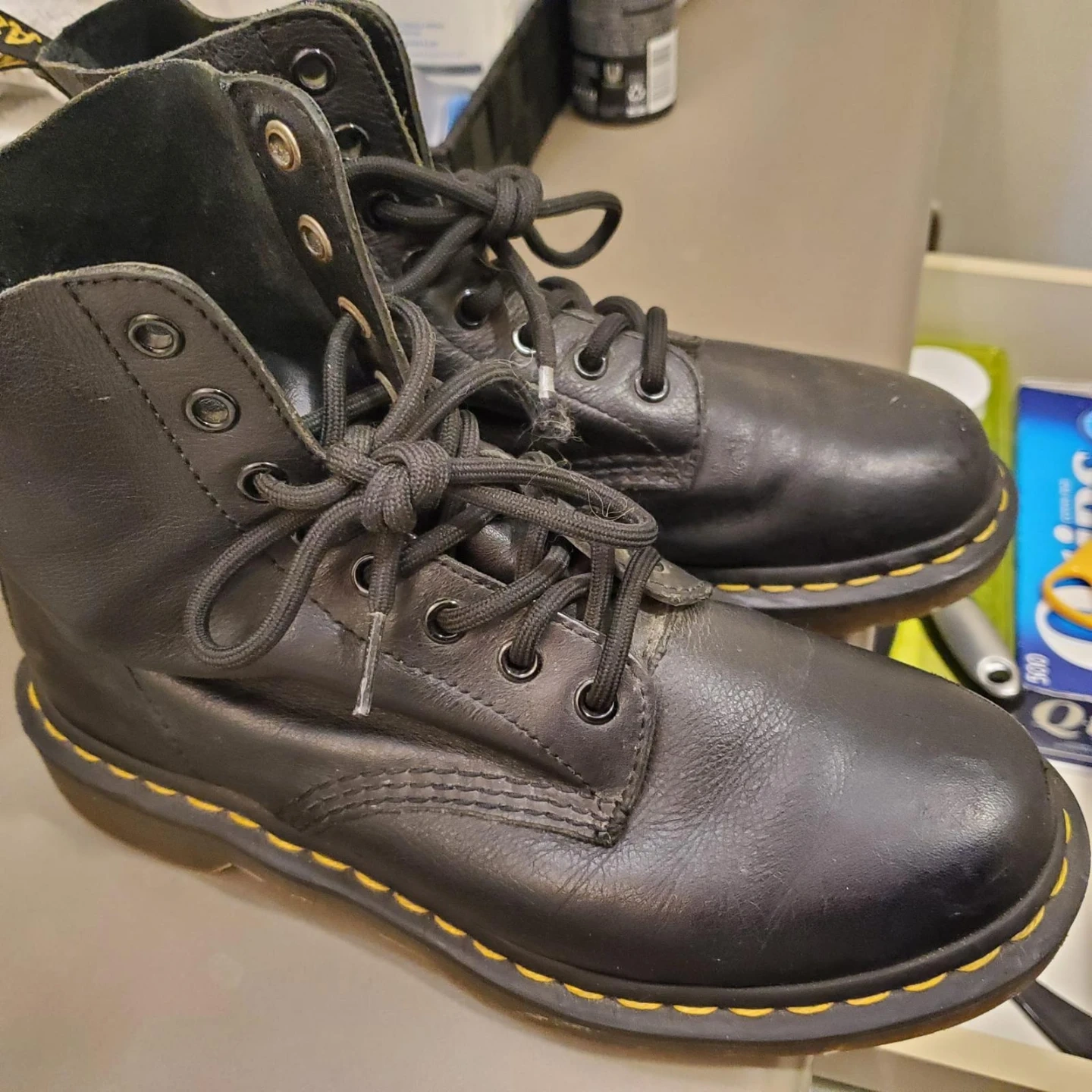 These are classic black Dr. Martens Pascal 1460 boots. They're made of leather with signature yellow stitching. The soles are durable and the boots are lace-up. They're suitable for everyday wear.