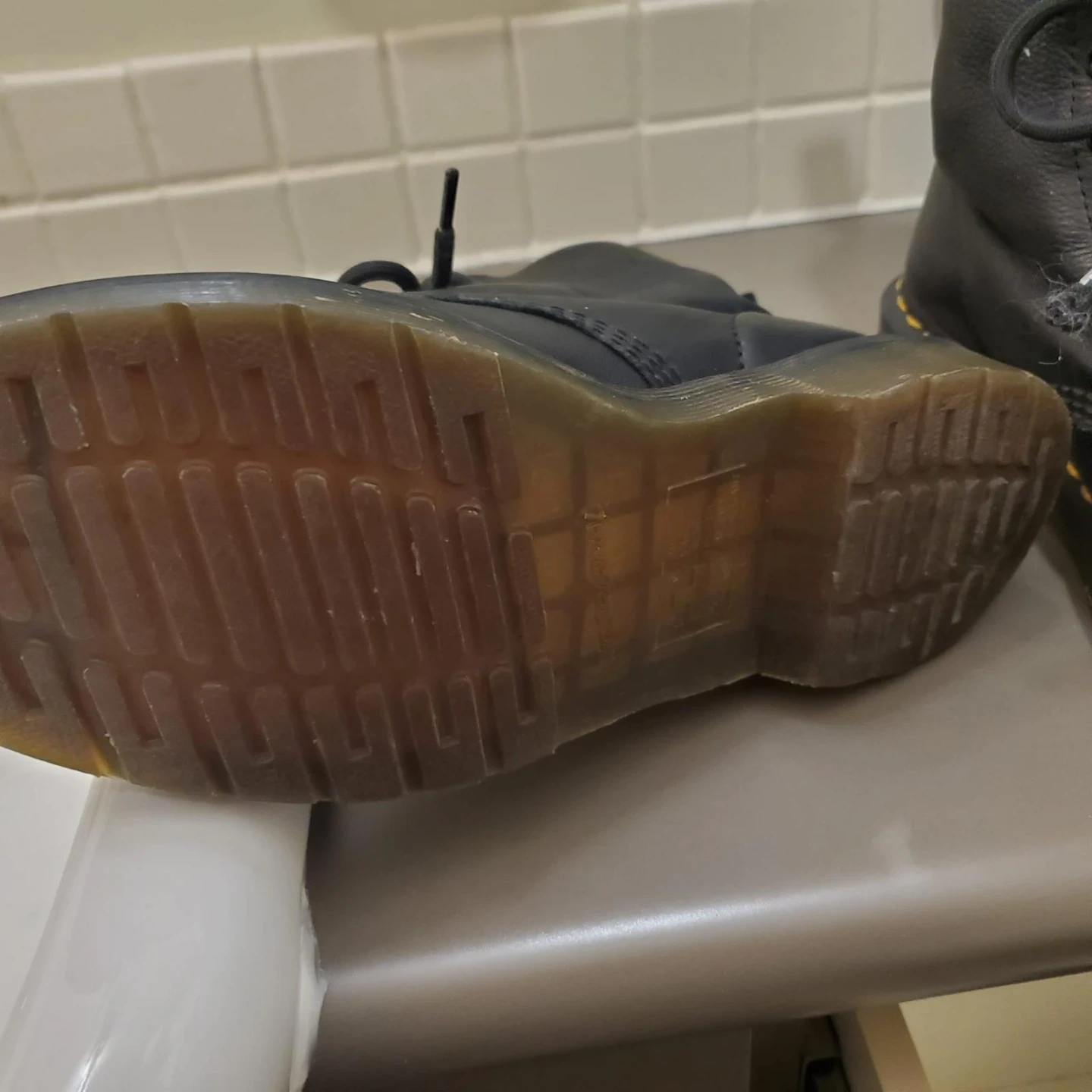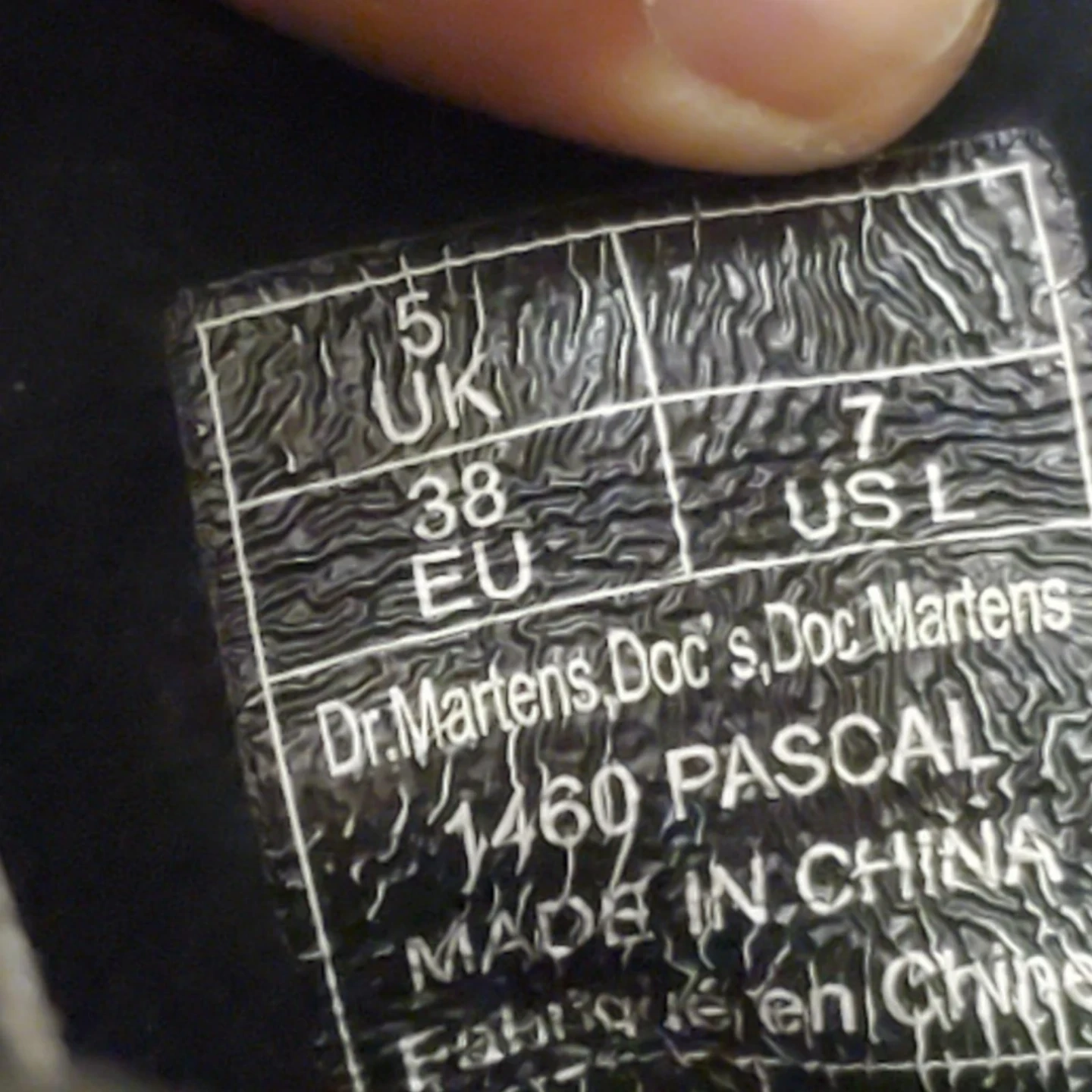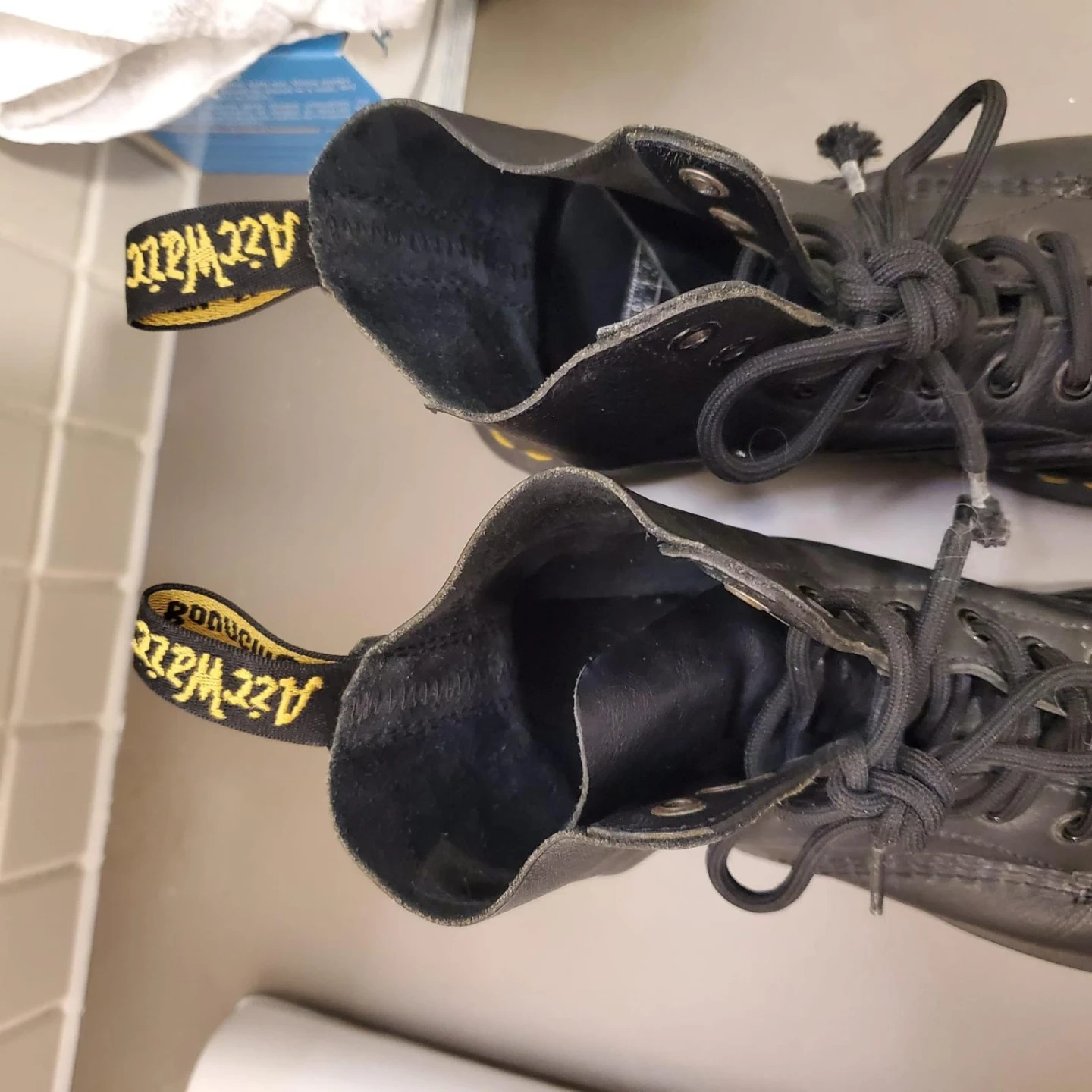 These are classic black Dr. Martens Pascal 1460 boots. They're made of leather with signature yellow stitching. The soles are durable and the boots are lace-up. They're suitable for everyday wear.