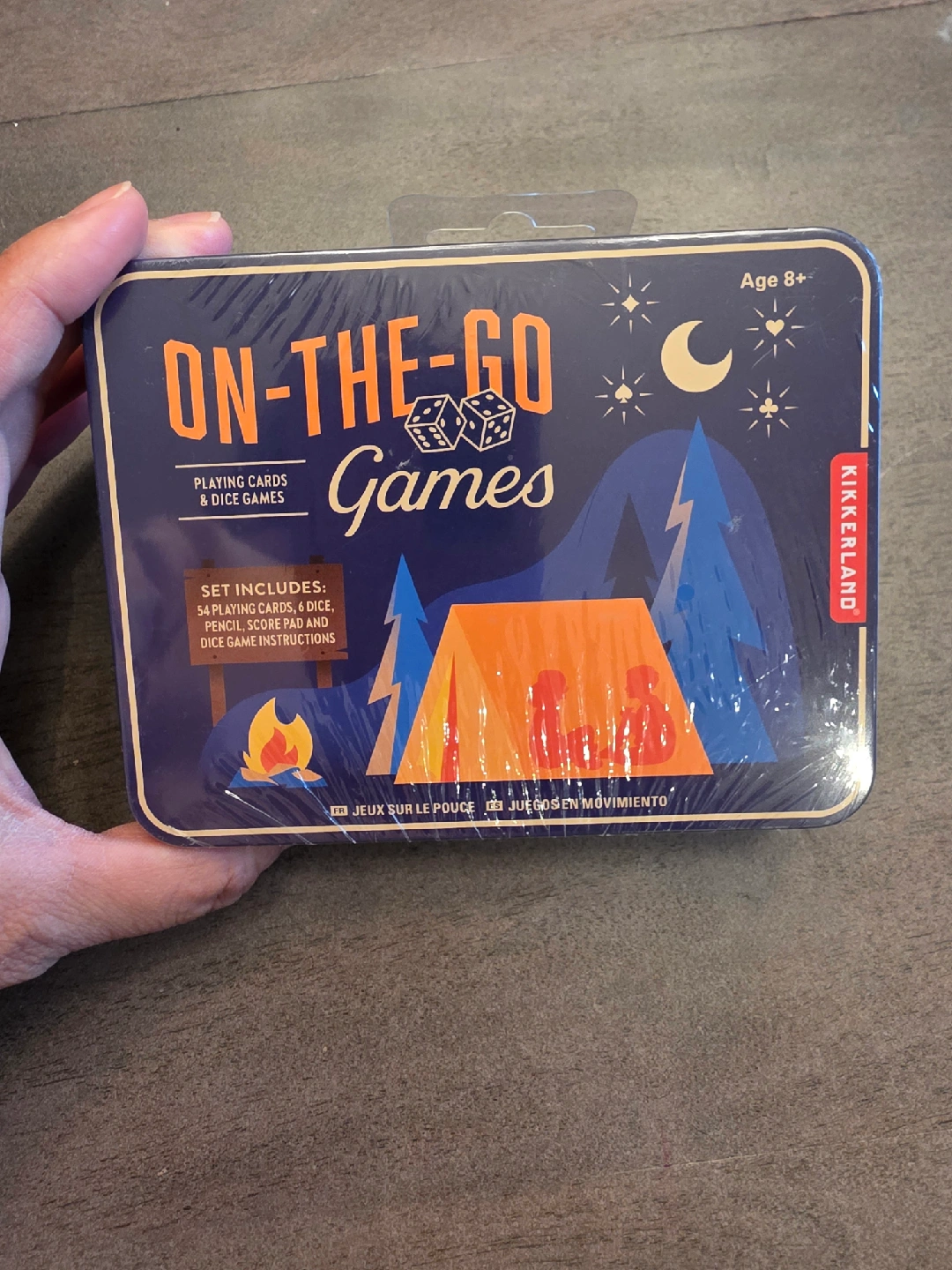 Selling a brand new Kikkerland On-The-Go Games set! This fun little kit includes playing cards, dice, a pencil, a score pad, and instructions for different dice games. Perfect for travel or a fun night in! Recommended for ages 8+