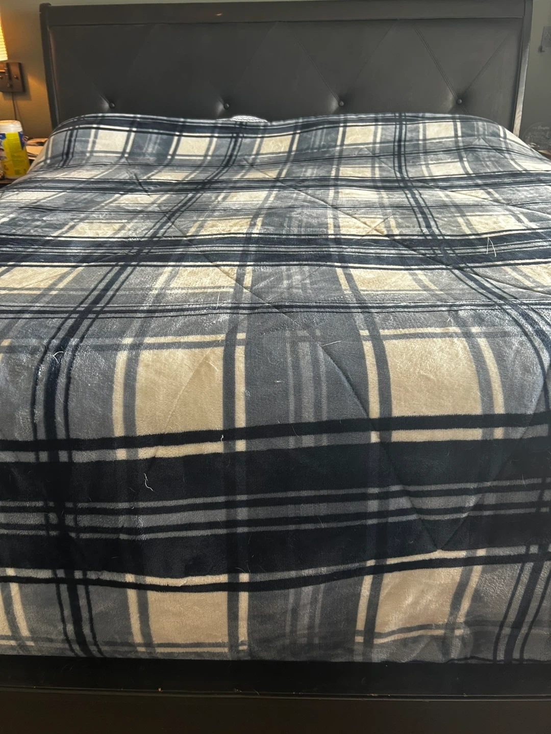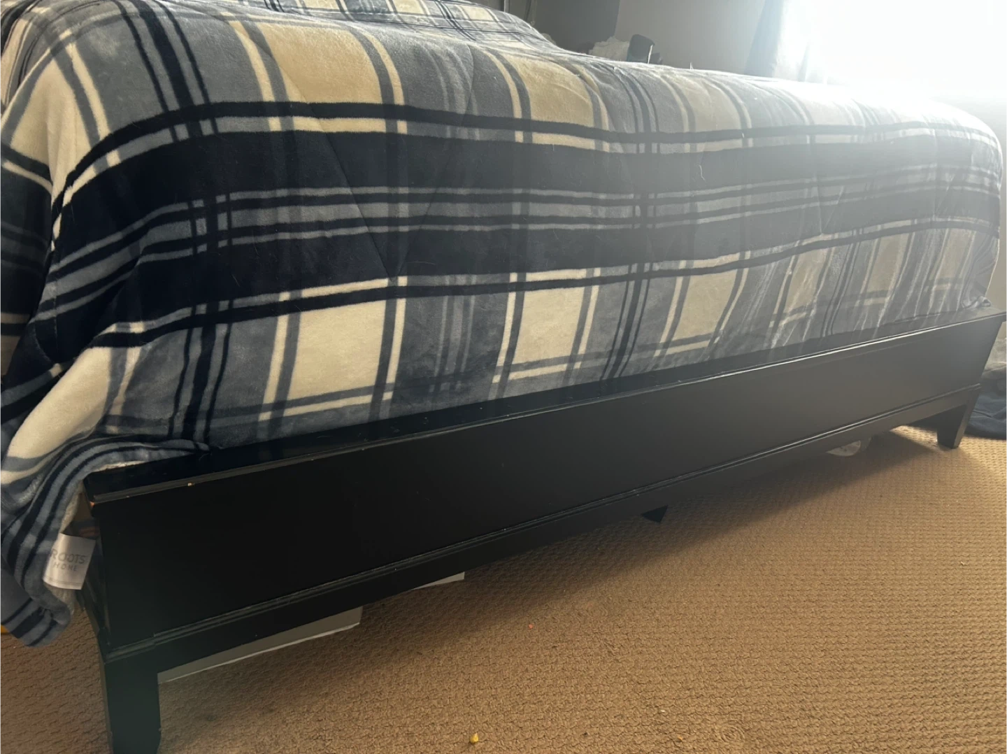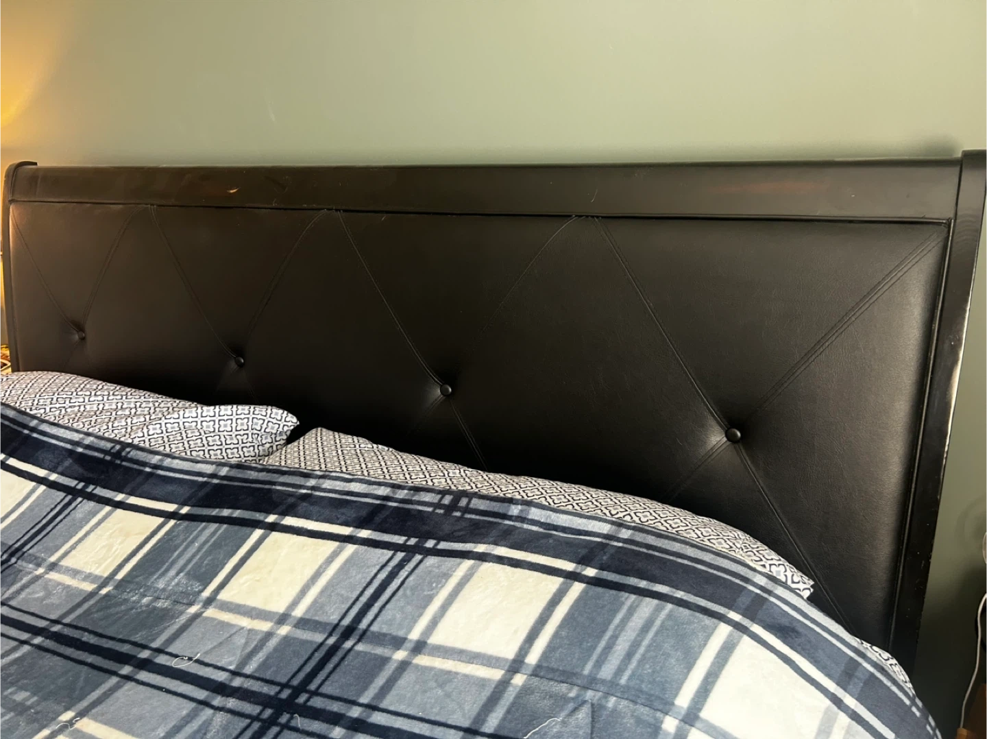 65Good condition king bed frame in black/walnut colour with black leather insert in the headboard. Minor knicks, imperfections and scrapes due to wear, moving & general life. Bed frame: total dimensions 79.5”W x 86”L Bottom of frame to floor: 4.75” Footboard: 79.5”L x 14.75”H Headboard: 79.5”L x 54.5”H (curves backward slightly) Pick up in Albion 102/240 area.