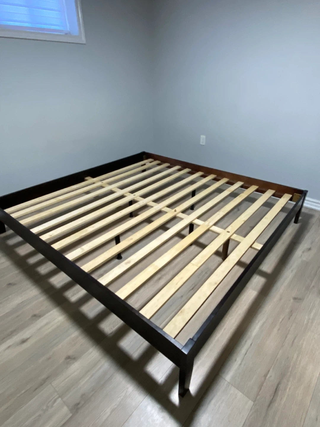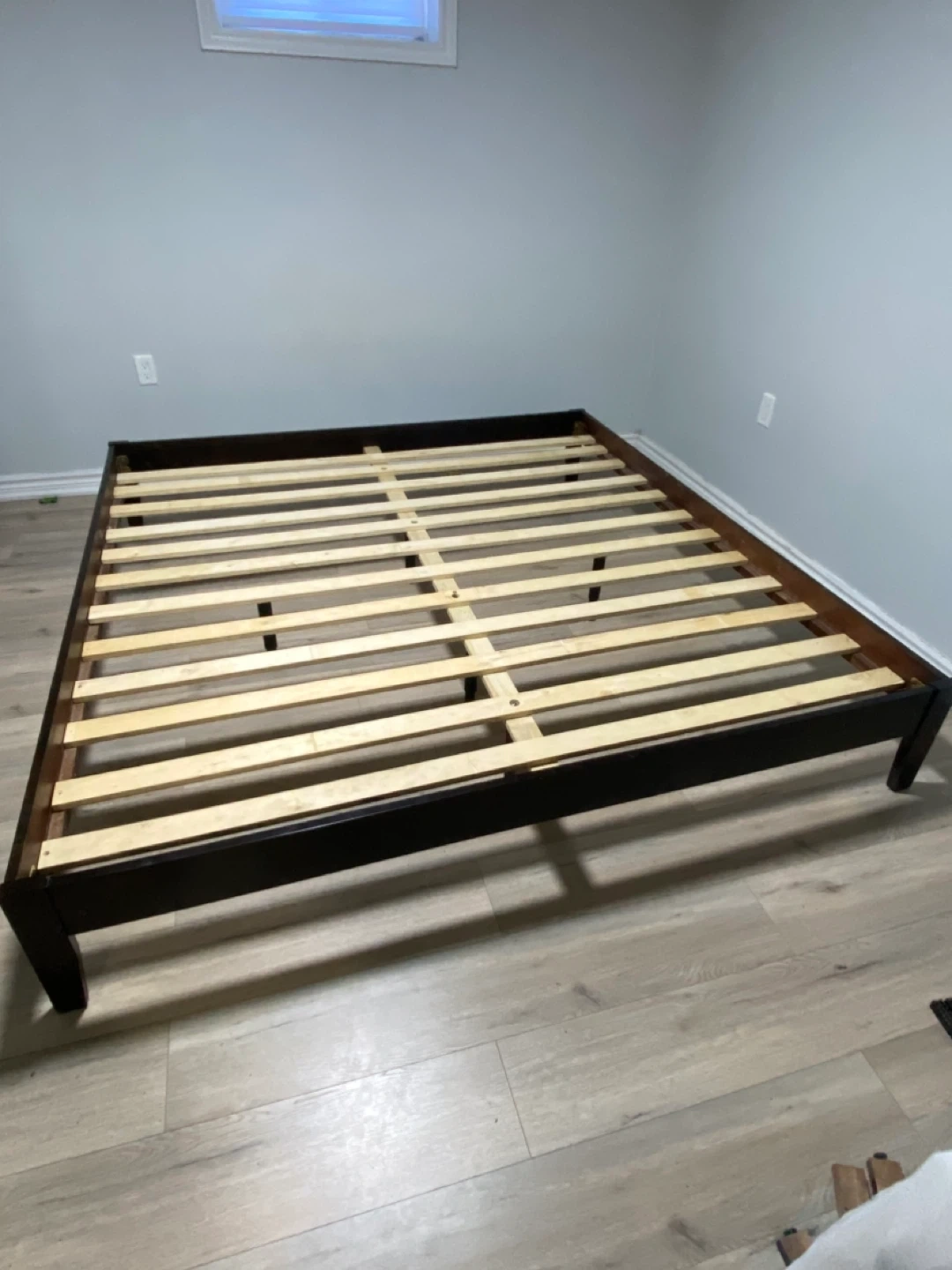 King bed frame in good condition and comfortable. Included additional solid legs. Easy to assemble and fits any standard king mattress. Perfect if youβre looking for a solid frame at a great price! π Size: King ποΈ Condition: Good π Pickup in Scarborough First come, first serve β priced to sell fast!