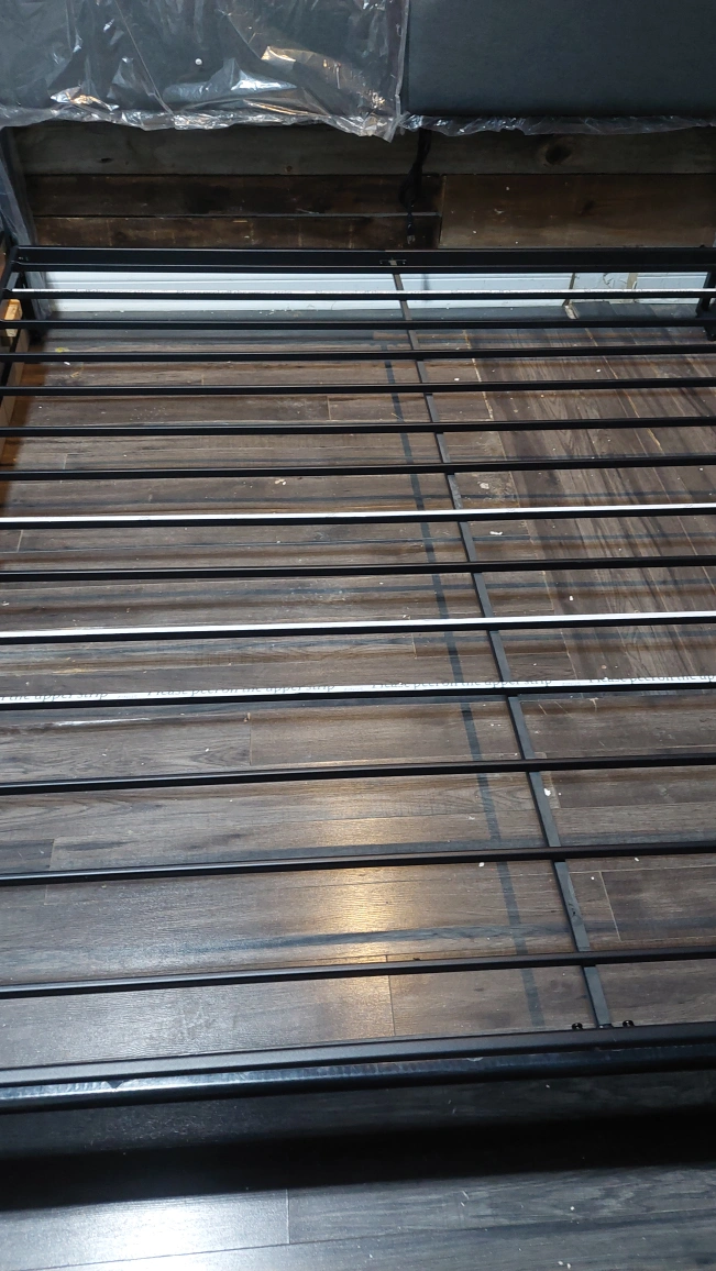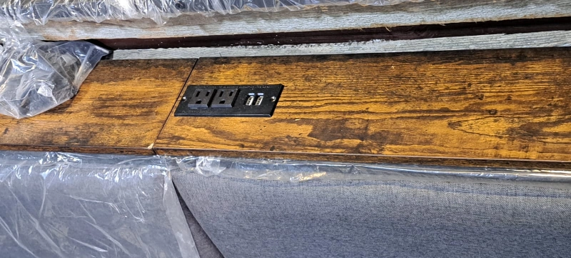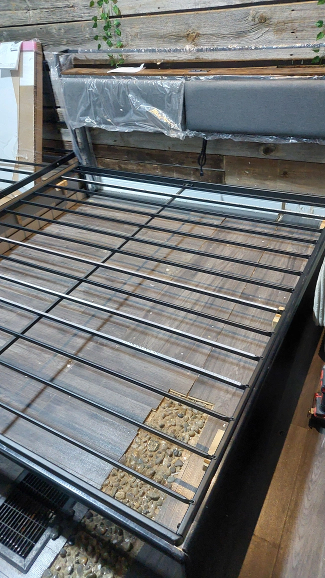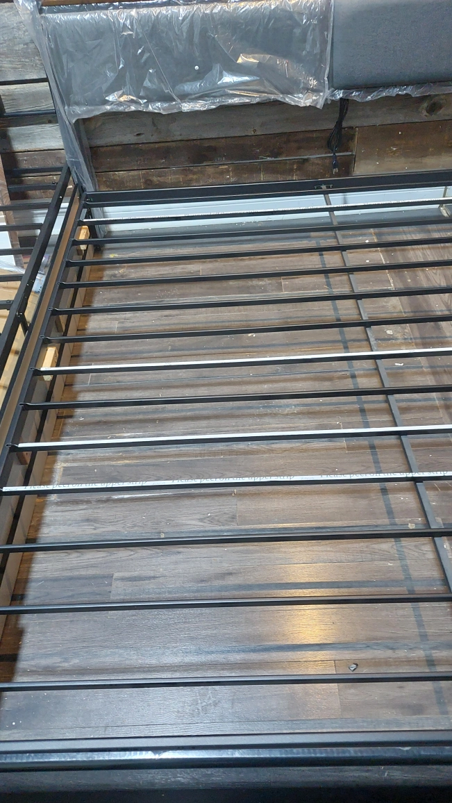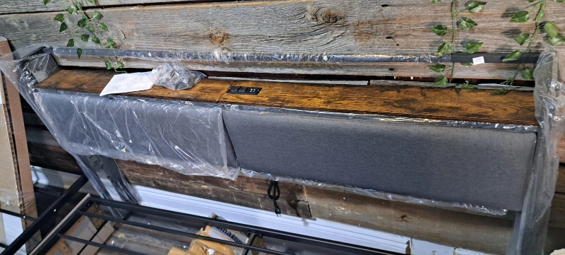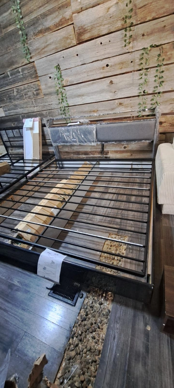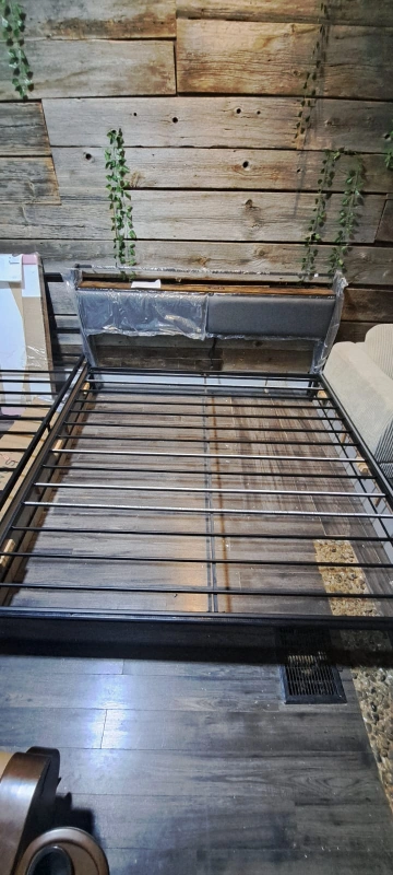 Selling a king size bed frame. It features a headboard with built-in USB ports and outlets, perfect for charging your devices overnight. The frame is sturdy and in great condition. Ready to assemble and bring comfort to your bedroom!