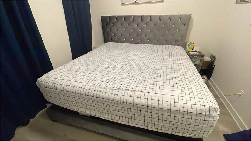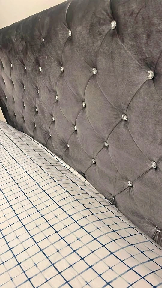 60Very good condition king bed frame with matress and spring box. Upholstered velvet fabric with tufted frame, offering a luxurious and elegant look. The soft velvet texture and deep tufting add comfort and sophistication to any bedroom décor. Pet free home.