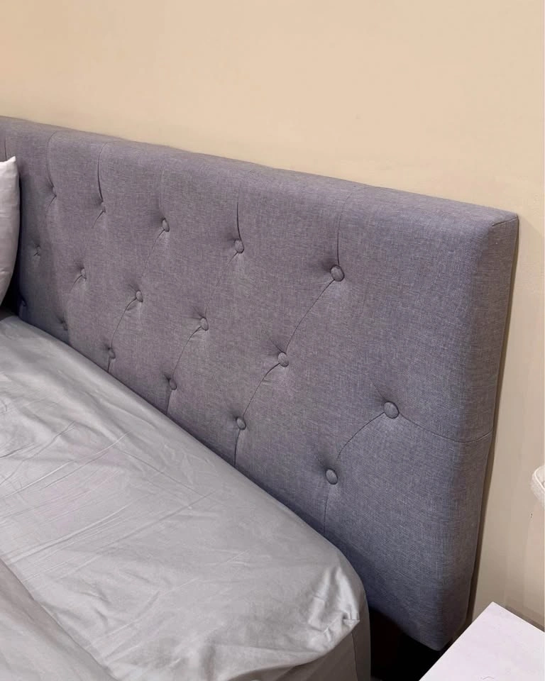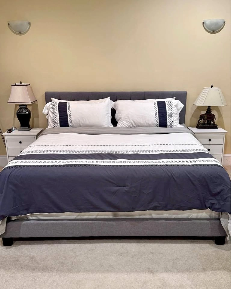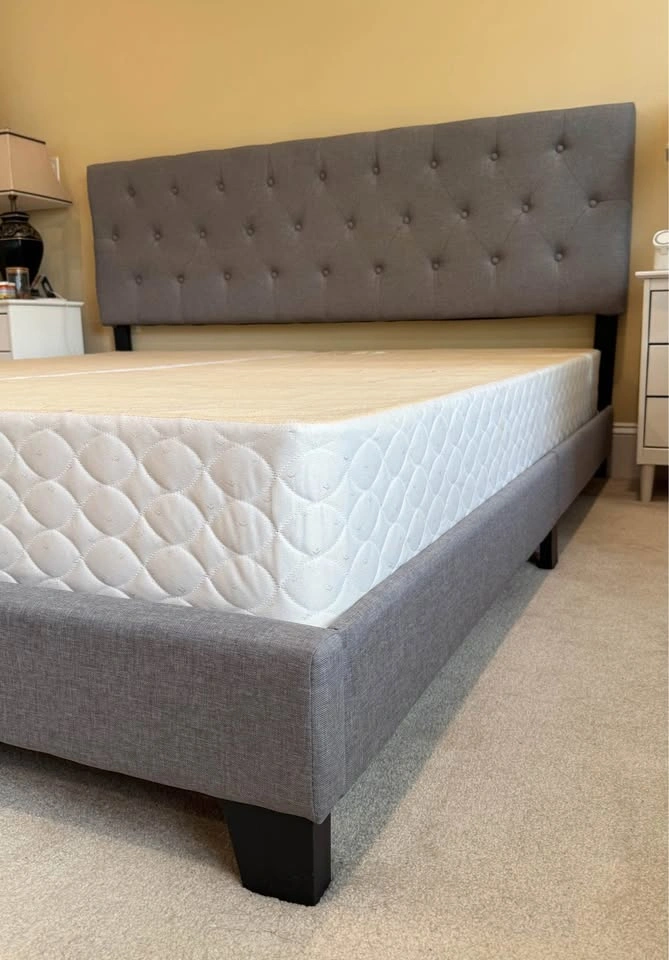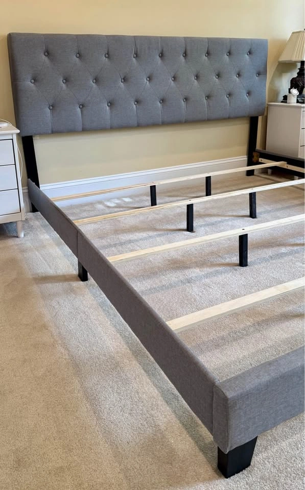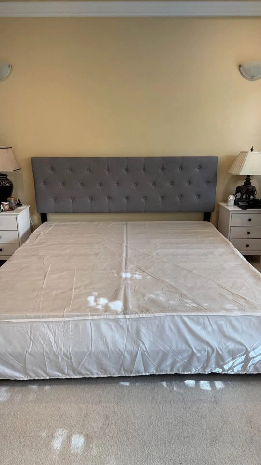 King size bed frame (spring box required and included in price). Bed skirt (fabric) included to cover the spring box. Bed frame and spring box only - no mattress. Pick up only. From non smoking, no pets home.