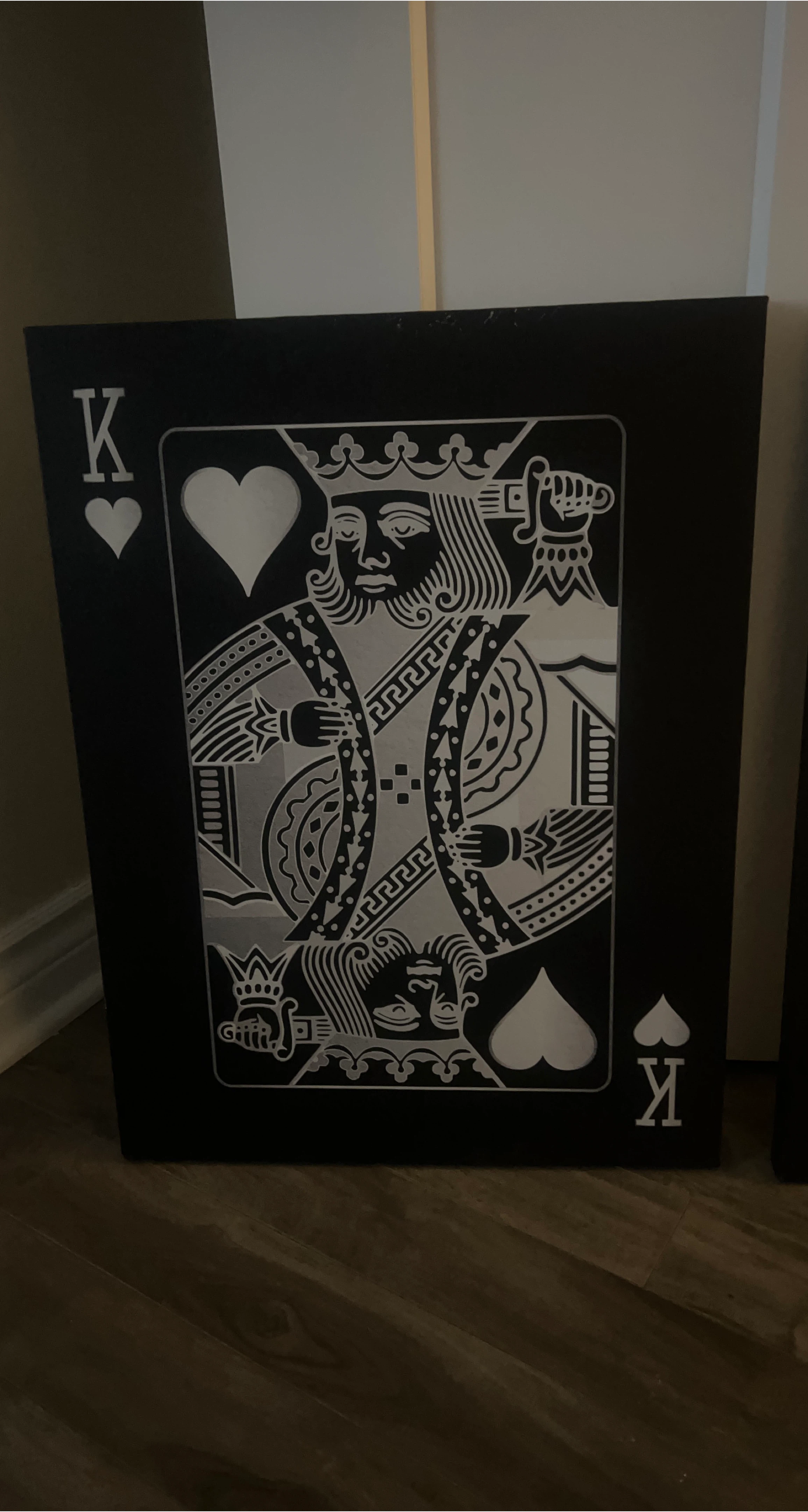 Here's a cool piece of wall art featuring the King of Hearts playing card design! It's a striking black and silver colour, perfect for adding a touch of personality to any room