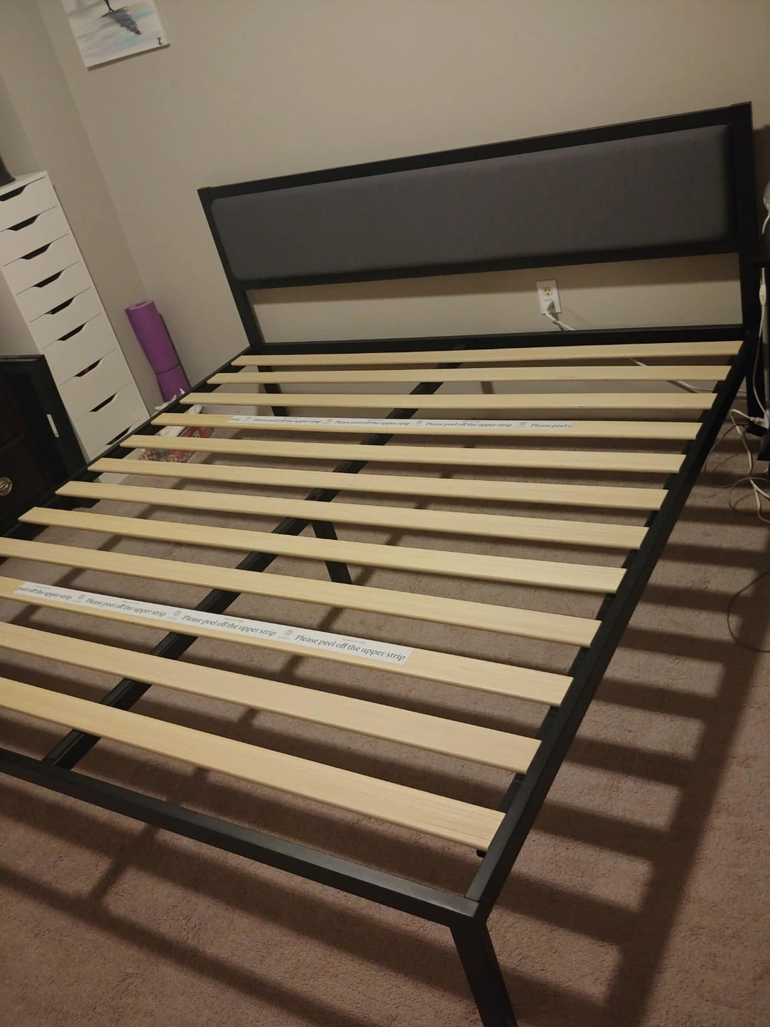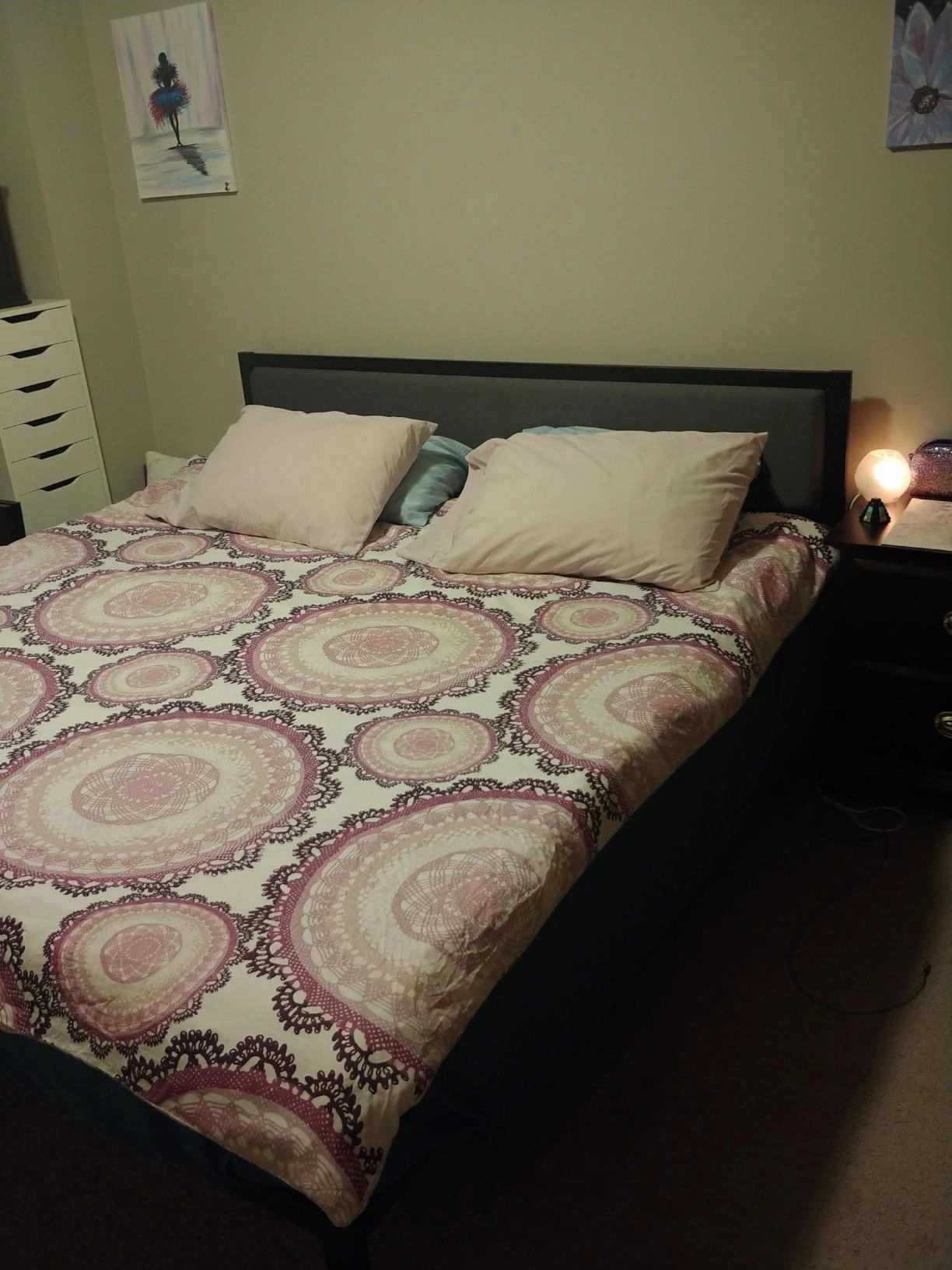 Selling a sturdy King-size upholstered bed frame with headboard. The frame measures 80.5" long by 75.5" wide, with a headboard height of 38". It has a 12" clearance underneath, it has a lot of storage space — enough to fit full-size suitcases, storage bins, and boxes. Built with a strong steel frame and wooden slats, it does not require a box spring and supports all King-size mattresses, whether foam, spring, or hybrid. The upholstered grey headboard gives it an elegant look. The bed is in excellent condition, gently used, sturdy, and comes from a clean, smoke-free home. Asking price is $280. The frame is under warranty until November 2028 from its manufacturer- Zinus. Pick-up in Mississauga starting October 12, with viewings welcome before that date if you’d like to see the frame in person. This is part of a moving sale — I’m also selling other furniture and household items, so please check my other listings as well.