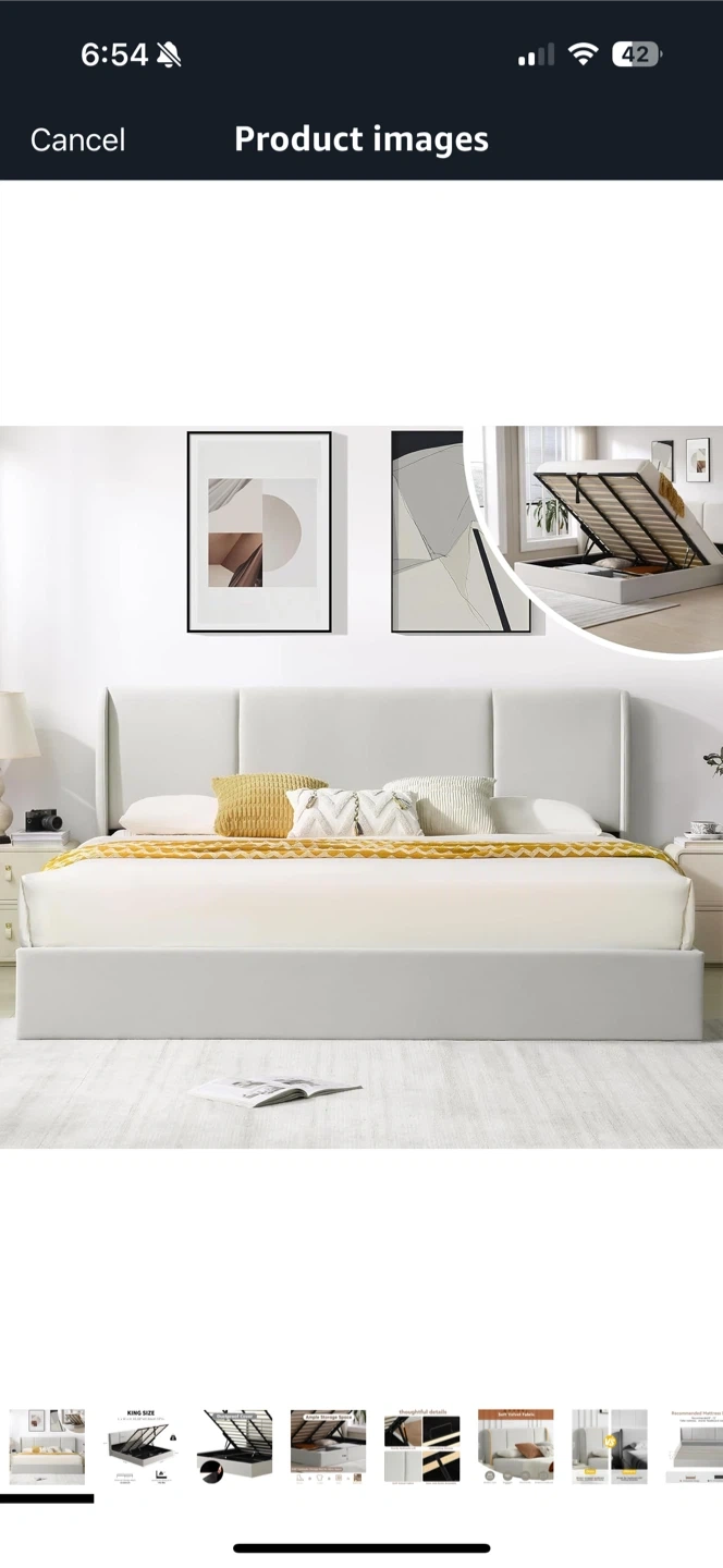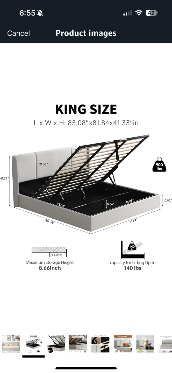 10Selling a brand new king size bed frame! It features a maximum storage height of 8.66 inches and can lift up to 140 lbs. The dimensions are approximately 85.08" x 81.84" x 41.33". A great way to maximize space in your bedroom Need gone asap doesn’t fit room