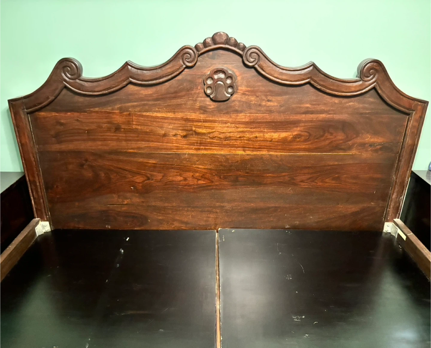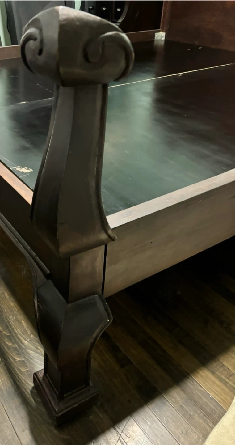 King size bed made of mango wood. Red undertones, beautifully carved headboard, footboard and legs (currently unassembled and bubble-wrapped). Wiped with soft cloth and treated with orange oil once a year to add shine to gorgeous wooden frame! Black wooden planks included.