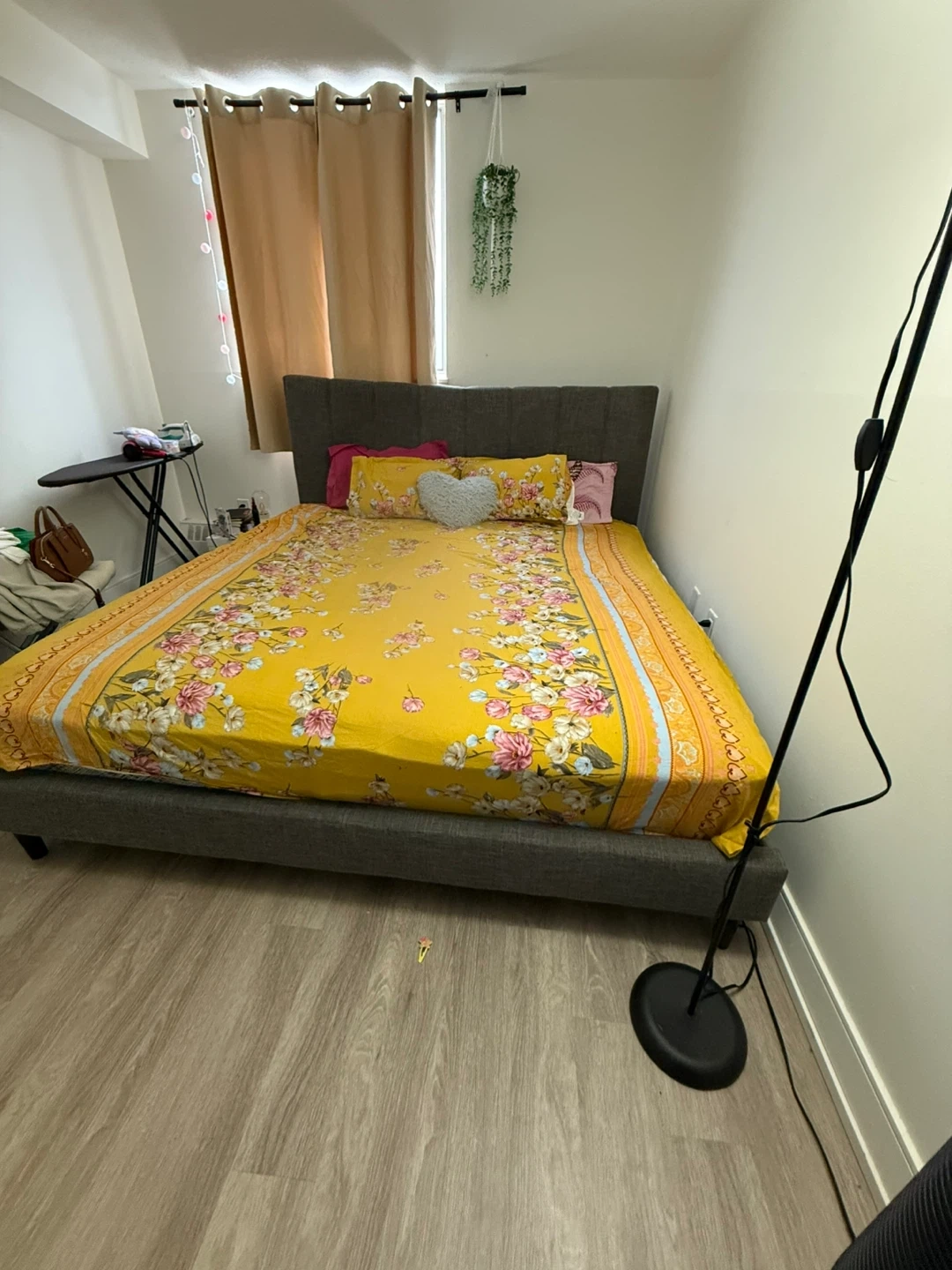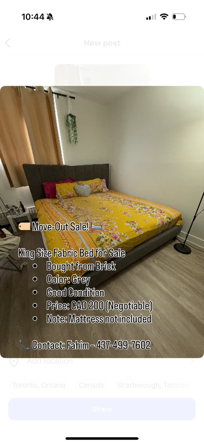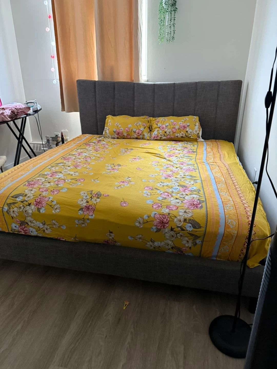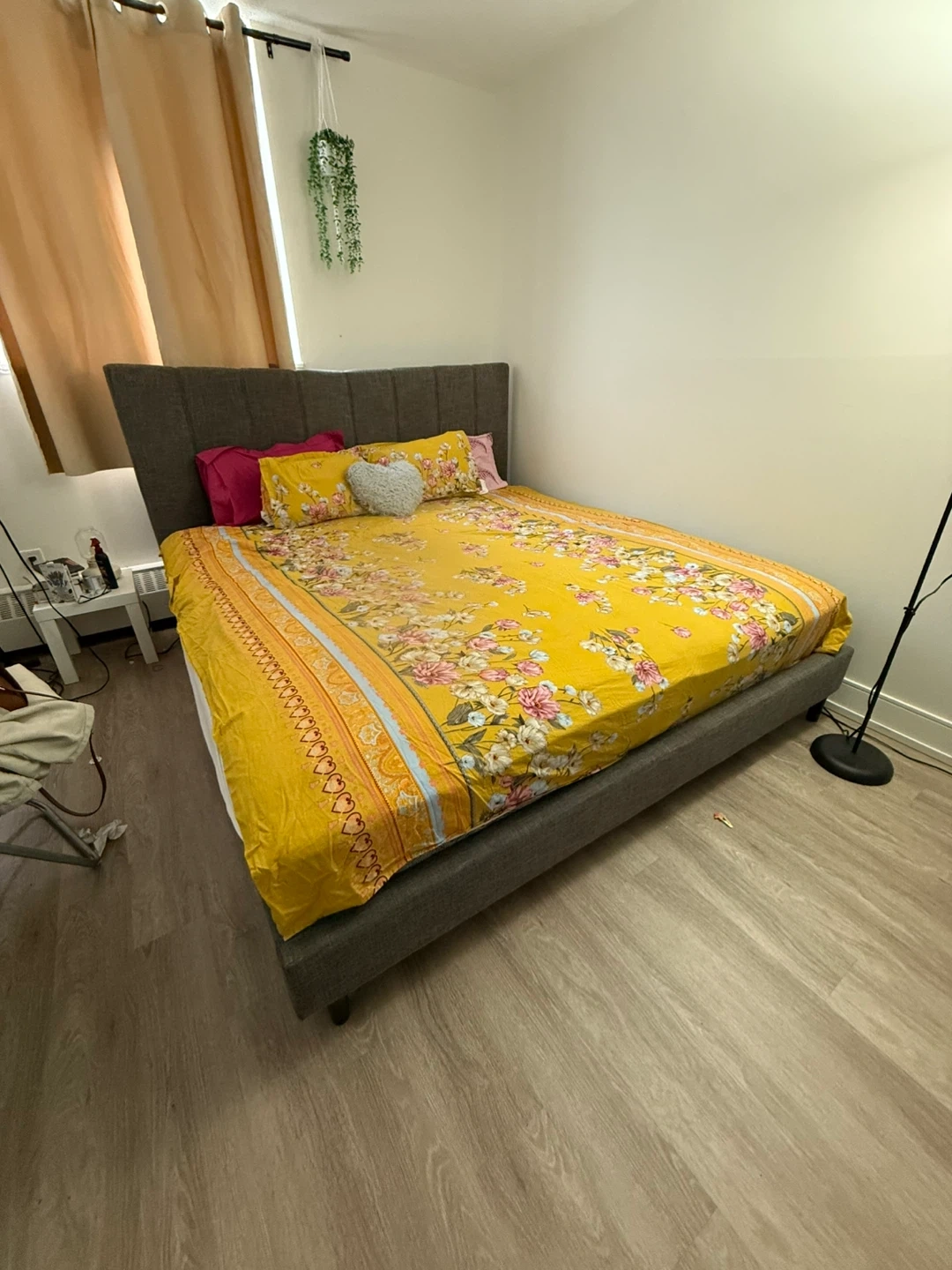 10Selling a king-size fabric bed in grey. It's in good condition. Bought from The Brick. Please note that the mattress is not included.