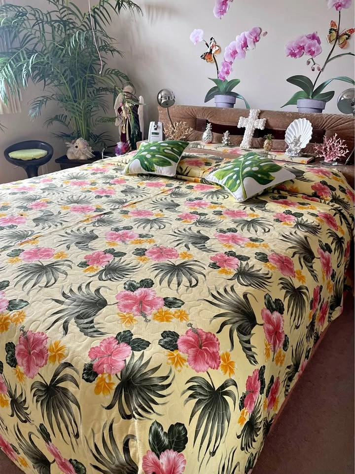 Homemade quilted king size bedspread; Tropical print, fabric purchased in Hawaii