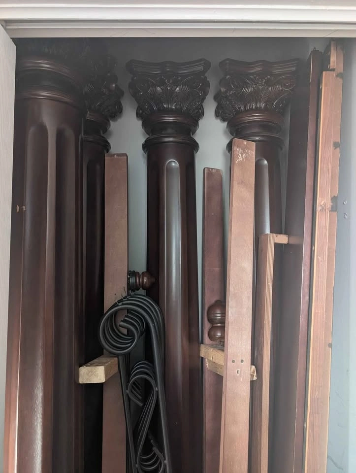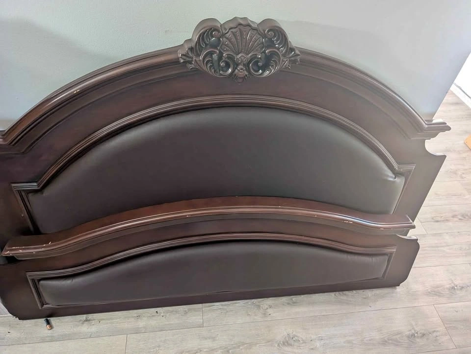 Rare and beautiful wooden bed frame originally from Ashley furniture, extremely durable and provides elegance to any room you desire. This comes disassembled but it is quite tall almost 7 feet tall at center point. The headboards I had recently touched up with brand new faux leather and soft cotton batting. The bed can accommodate a California queen bed or two twins, box spring are recommended for this as there are no slats for this. Let me know if you're interested!