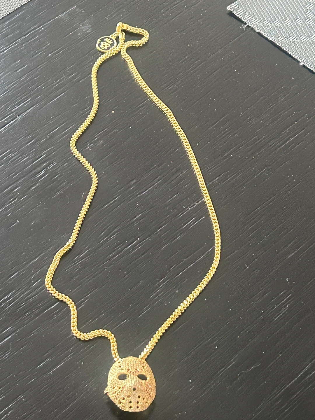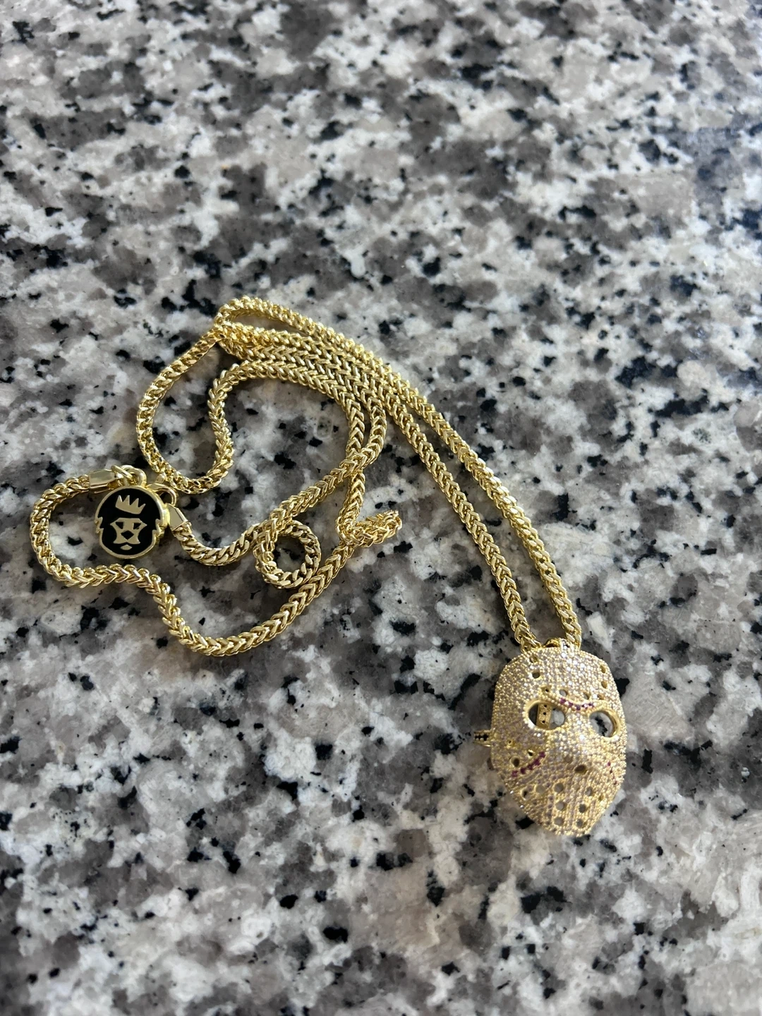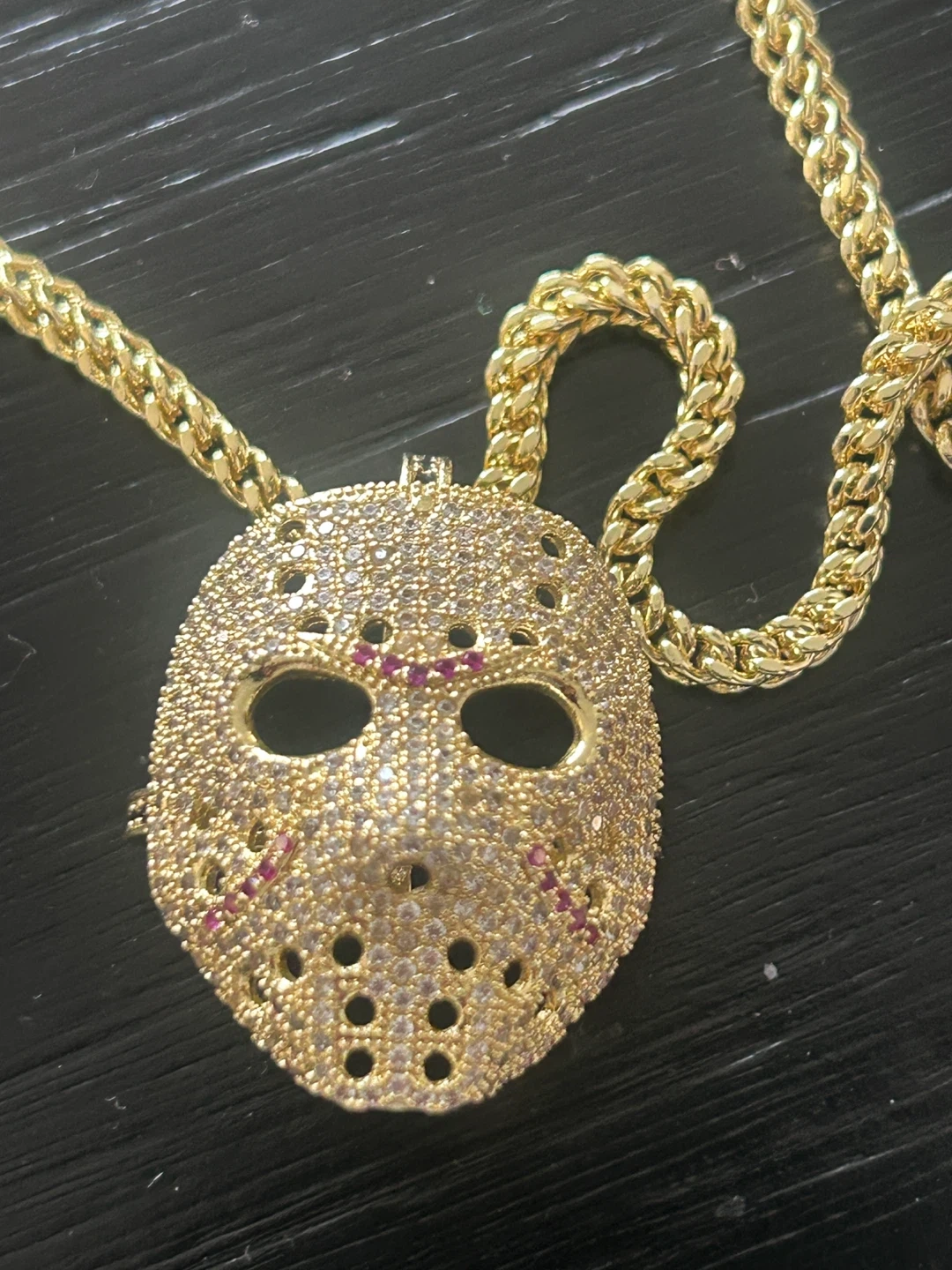 Selling a 14K plated gold-coloured KingIce hockey mask pendant necklace. It's in great condition and would make a cool statement piece! Plating: 14K Gold Material: brass Weight: 22.3g Stone quantity: 366 Stone type: VVS diamond simulate Stone color: white, red, black Stone cut: brilliant Stone setting: micro pave Brand: King Ice