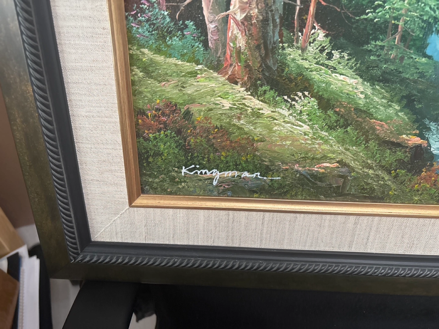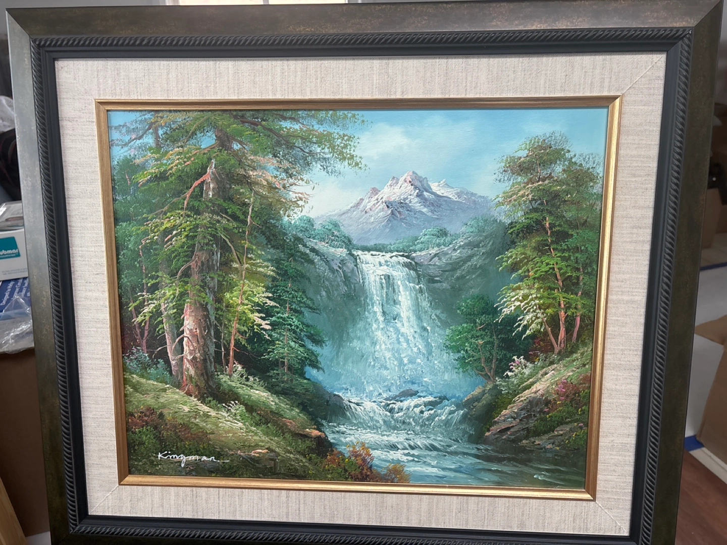 Beautiful framed landscape painting. Depicts a waterfall cascading down a mountain, surrounded by lush greenery. Features a snowy mountain peak in the background. Presented in a dark brown frame with a gold inner border.