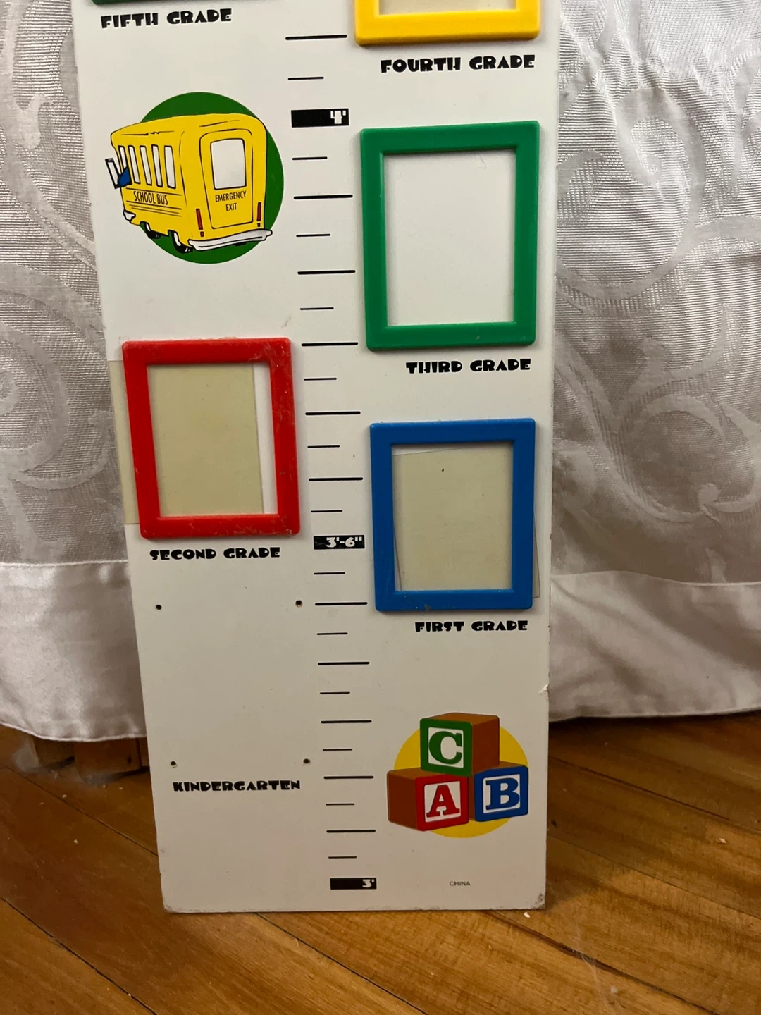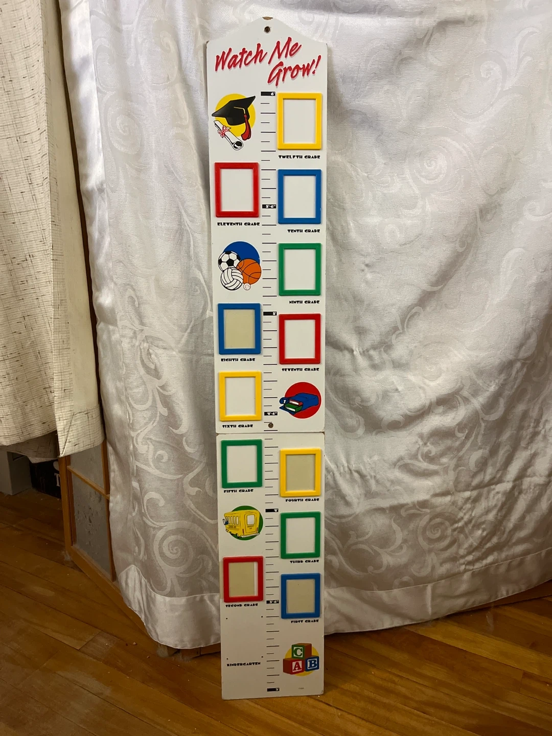 This "Watch Me Grow!" height chart is a fun way to track a child's growth. It includes multiple colourful photo frames, each labelled with a grade level from Kindergarten to Twelfth Grade. It's a sweet keepsake to document their school years!