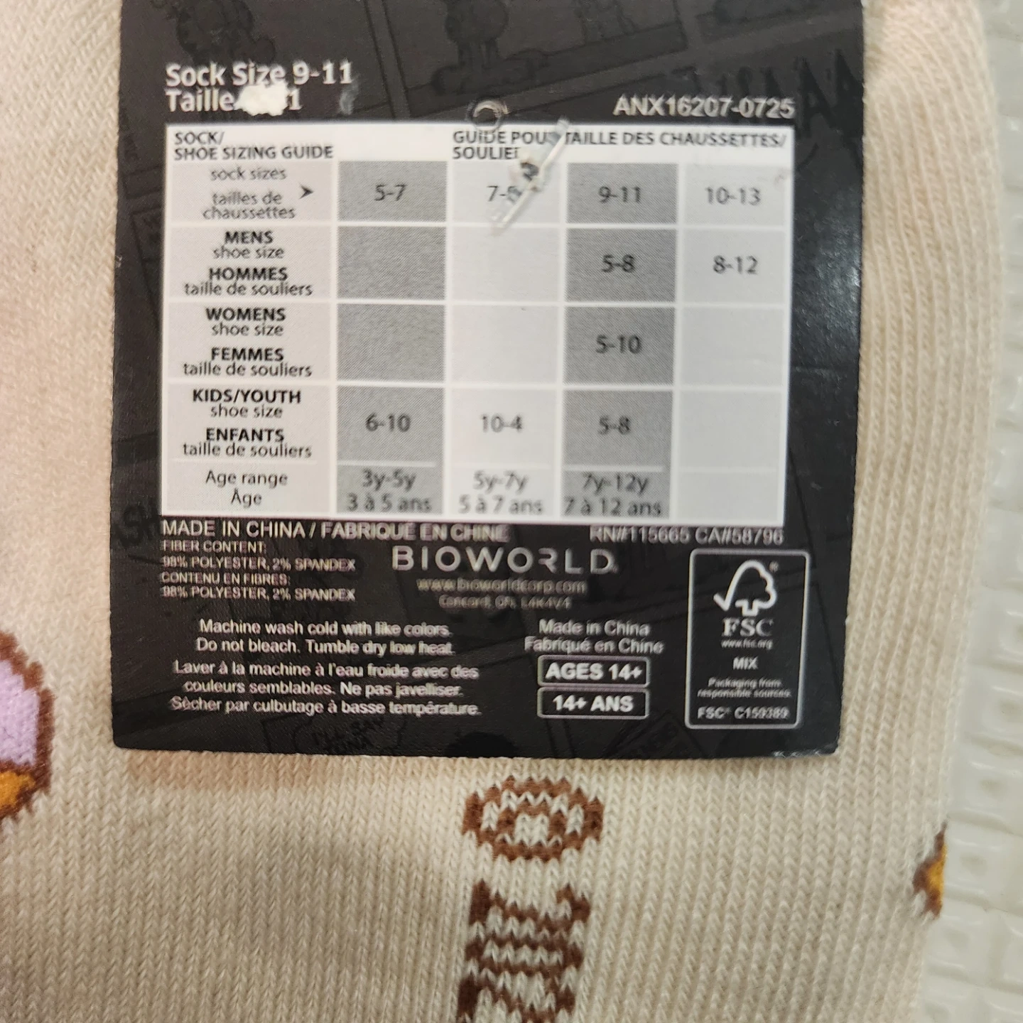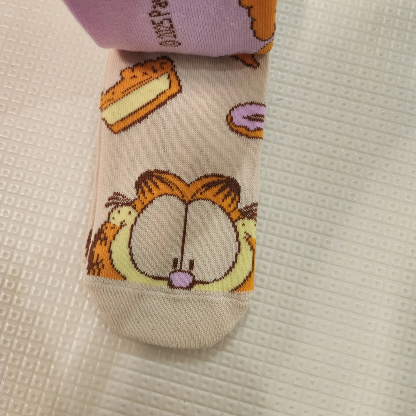 These fun anklet socks feature Garfield and his love for food! They're made of 98% polyester and 2% spandex. The socks fit shoe sizes 5-10. Fun for any Garfield fan!
