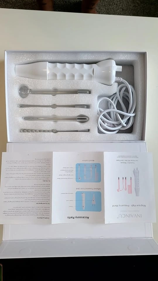 Multi-functional high frequency wand used for reducing acne, stimulating circulation, and improving skin tone. Includes multiple glass electrode attachments. Helps with fine lines, hair regrowth, and blemishes.