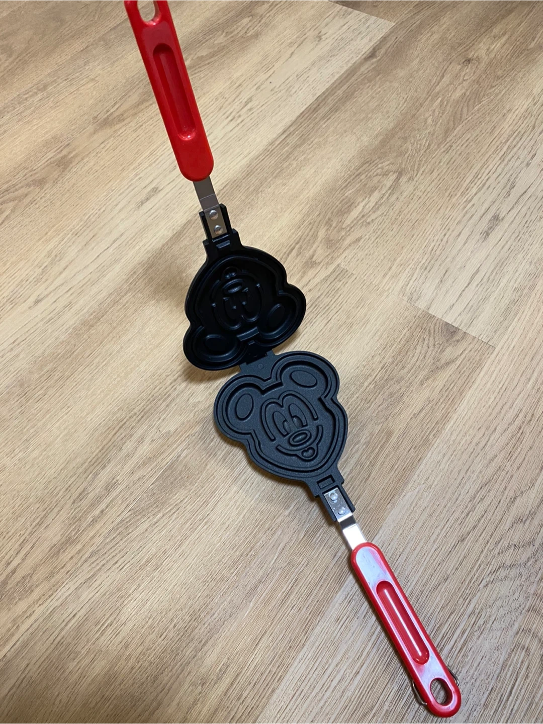 This is a Disney Mickey Mouse waffle maker. It has red handles and non-stick cooking plates. It's great for making fun breakfast treats!