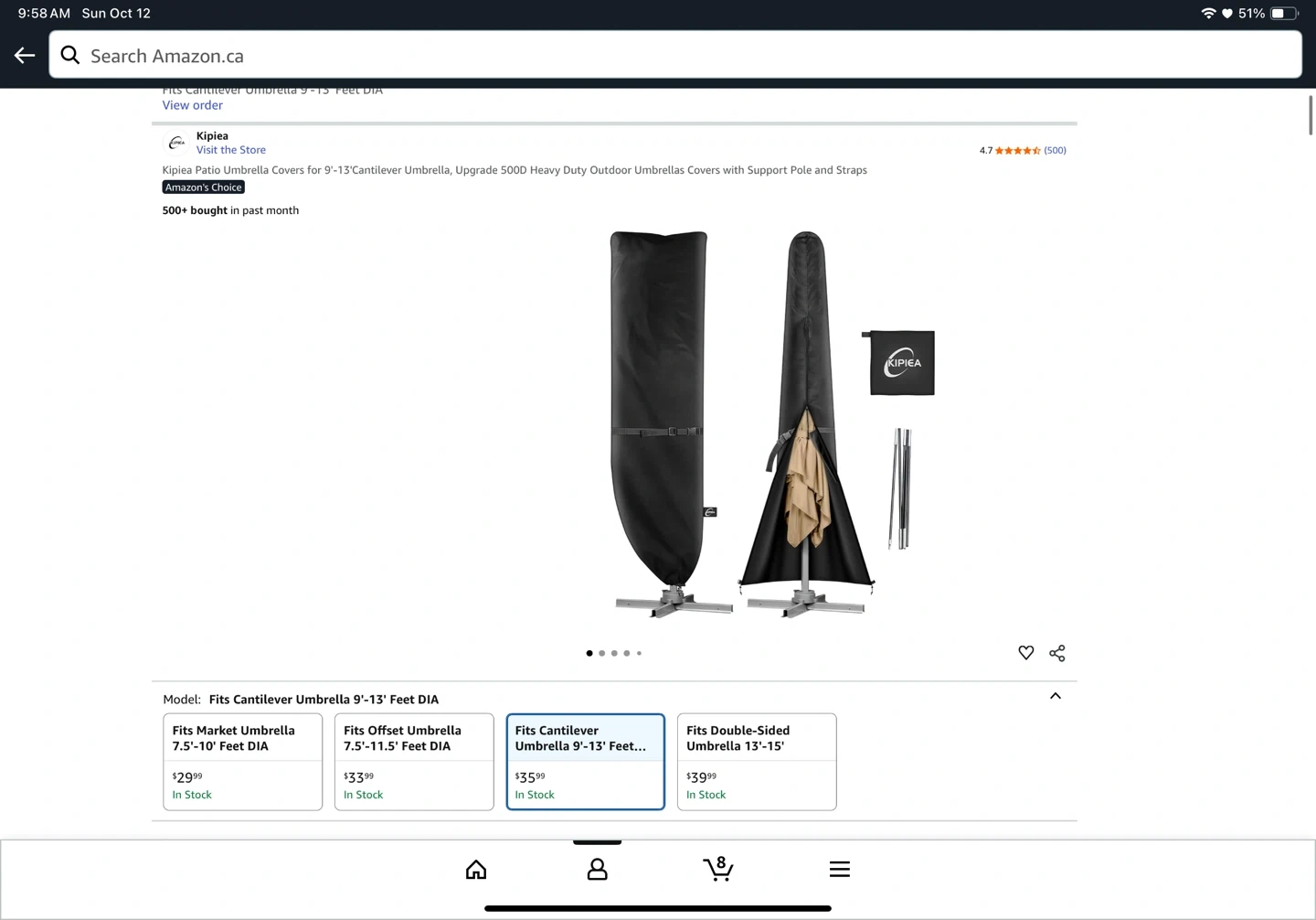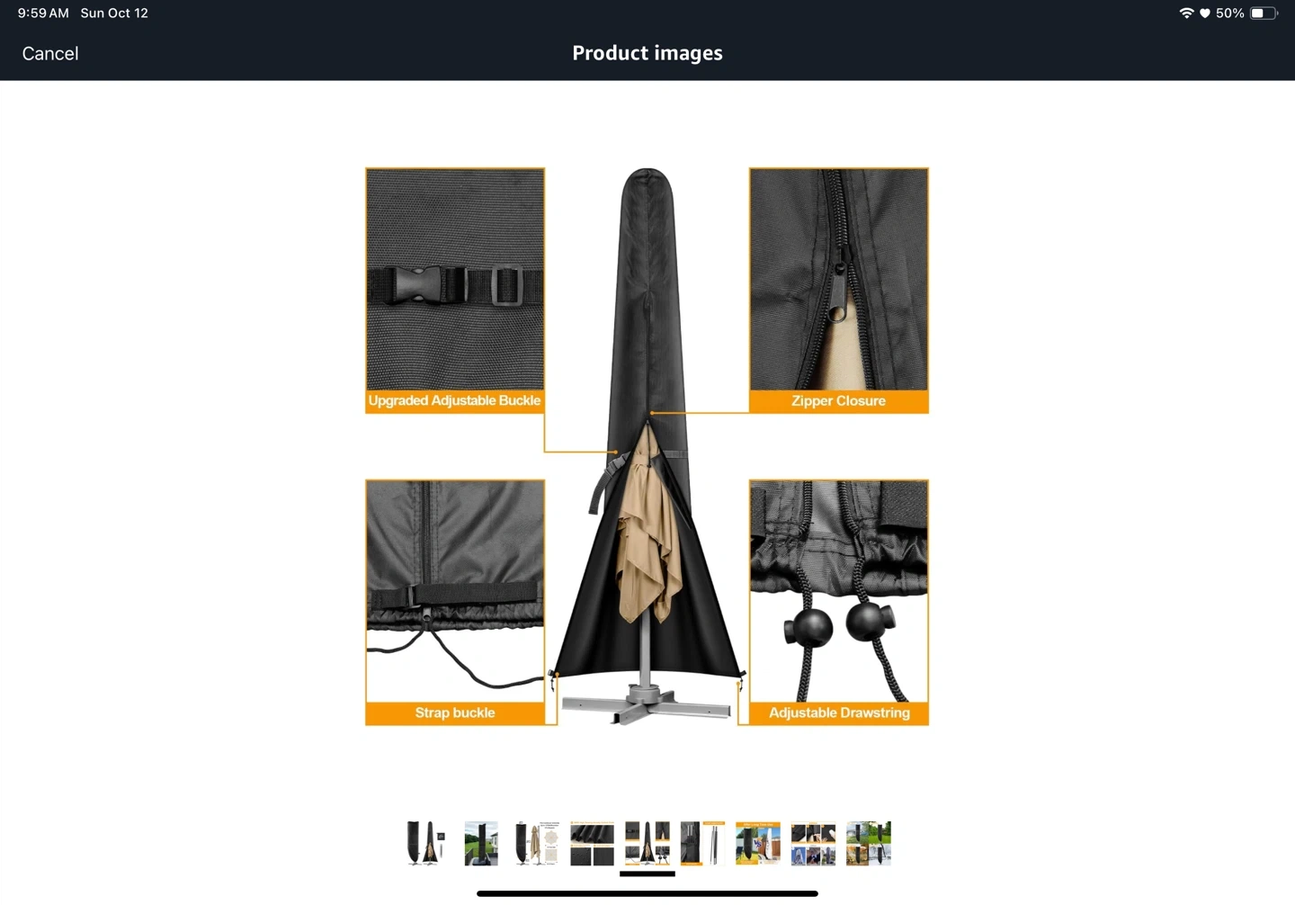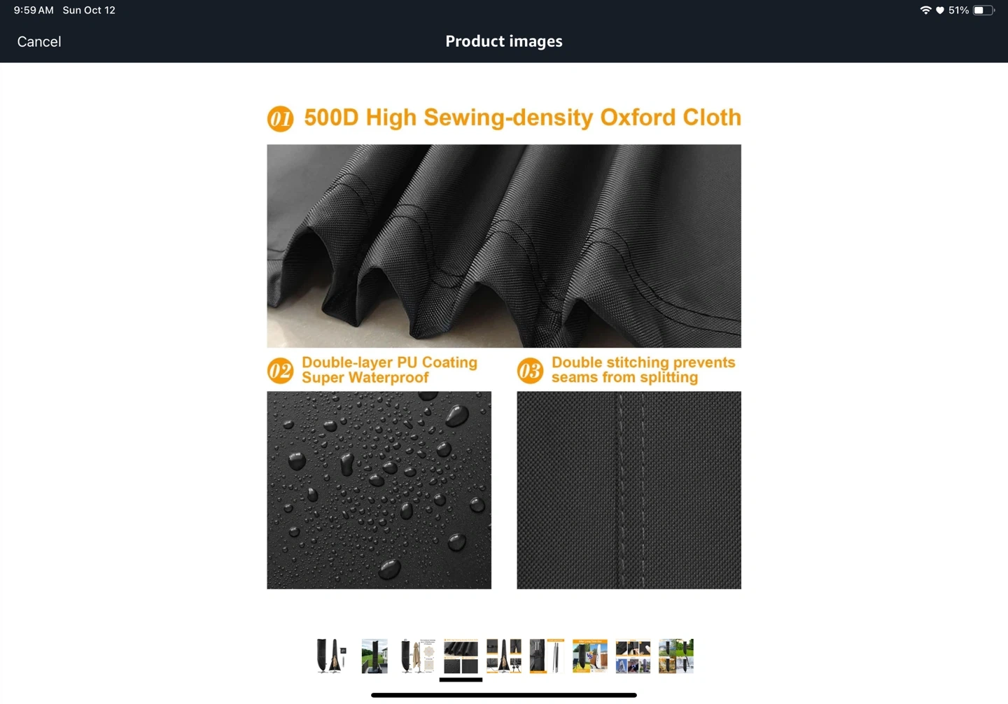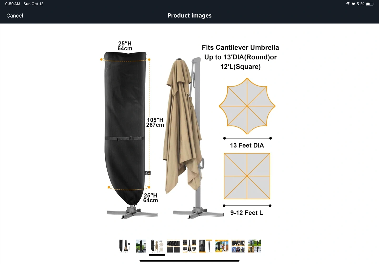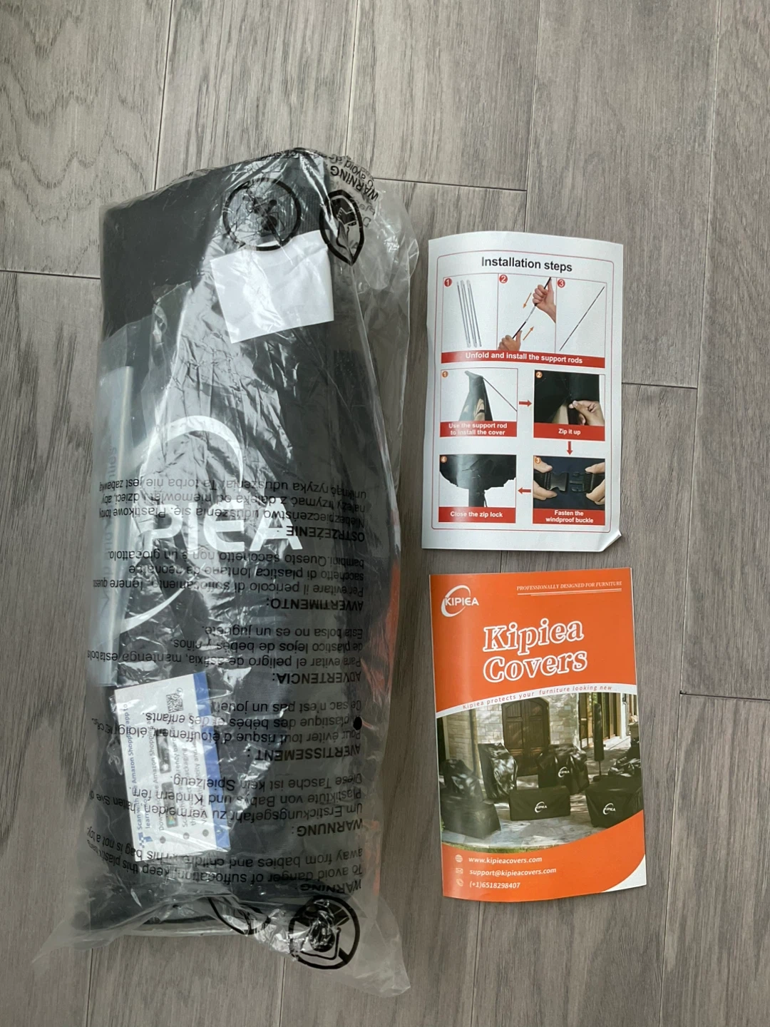 109Selling a Kipiea patio umbrella cover! It fits cantilever umbrellas from 9 to 13 feet in diameter or 12 feet square - Made of 500D high sewing-density Oxford cloth - Double-layer PU coating for super waterproofing - Double stitching prevents seams from splitting Includes installation steps and support rods!