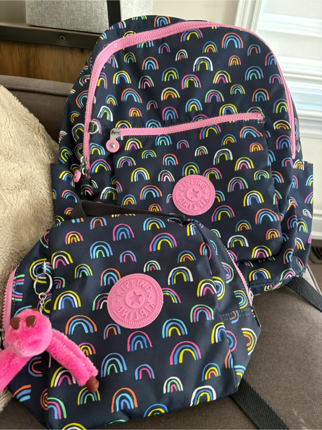 47Cute Kipling backpack and matching lunch bag set! The backpack has a fun rainbow pattern and the Kipling logo. The lunch bag comes with the signature Kipling monkey. Perfect for school or travel!
