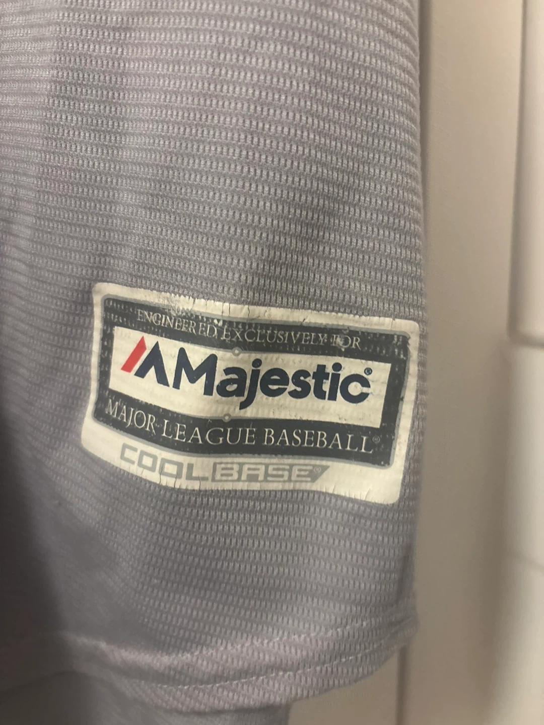 Majestic MLB Cool Base jersey for the Toronto Blue Jays. It's grey with blue trim and features the Toronto text across the chest with a Blue Jays logo. Made with Cool Base technology.