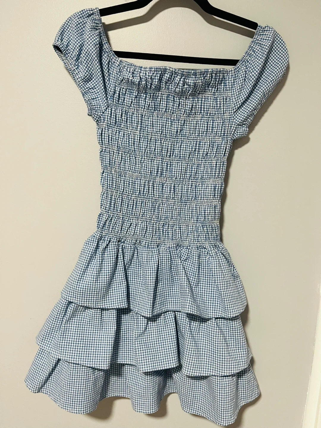 This Kirious LA dress is super cute! It features a blue and white gingham pattern with a tiered ruffle skirt and a smocked bodice. It's a size small and in great condition!