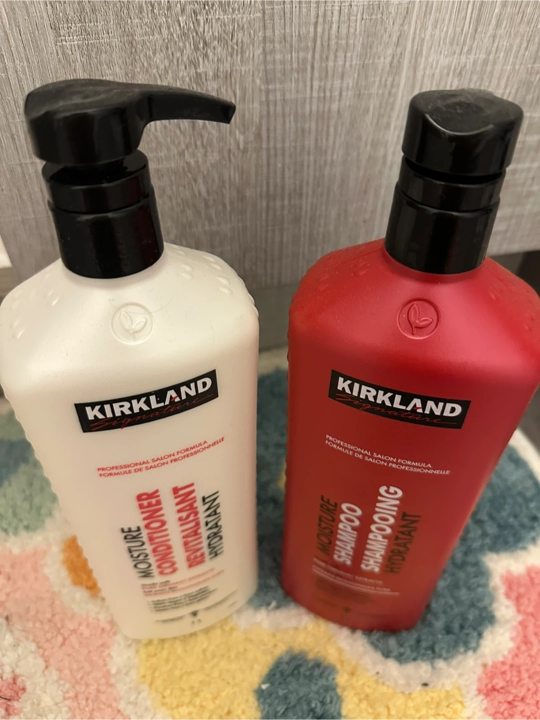 222Selling a set of Kirkland Signature professional salon formula shampoo and conditioner. The shampoo is in a red bottle and the conditioner is in a white bottle. Both are moisture versions to keep your hair looking its best!