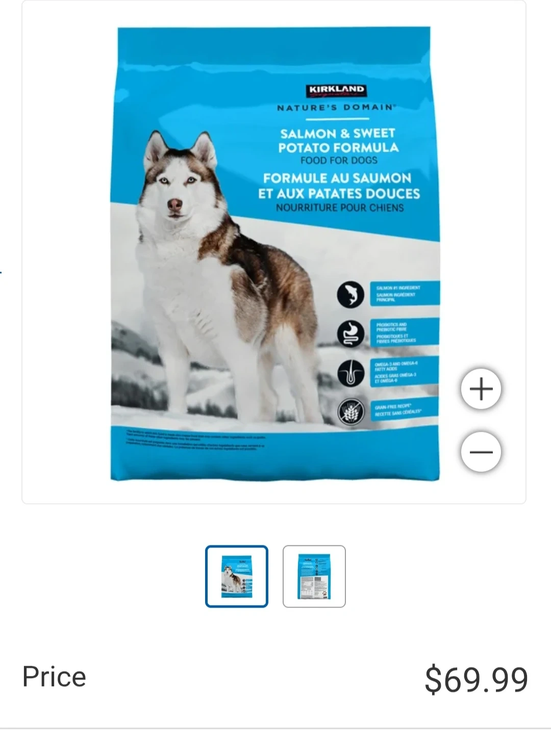 71Selling a bag of Kirkland Nature's Domain Salmon & Sweet Potato Formula dog food. It's a grain-free recipe, perfect for dogs with sensitivities. Originally bought for $69.99 (Amount before taxes) $79.09 (Total after taxes)