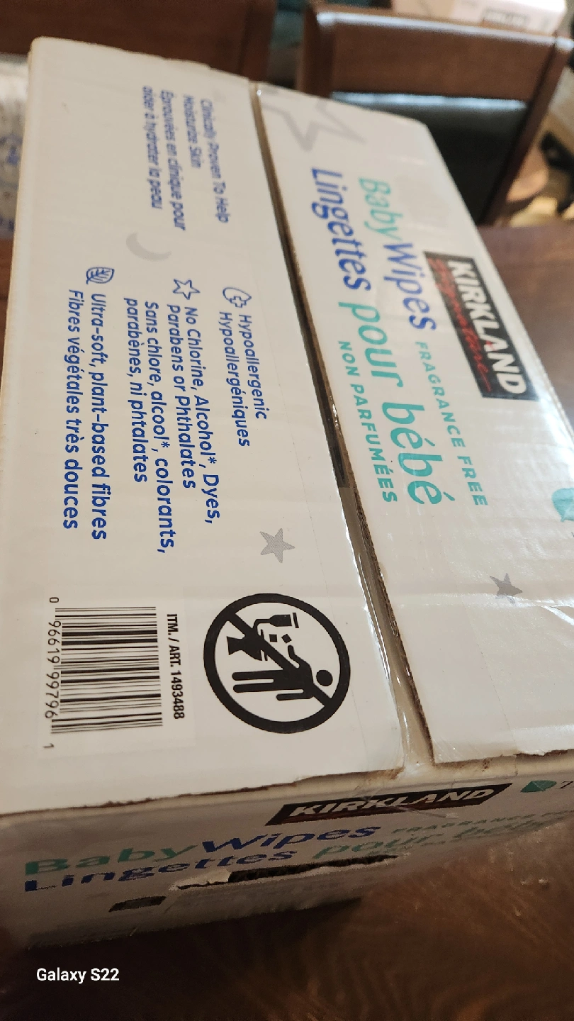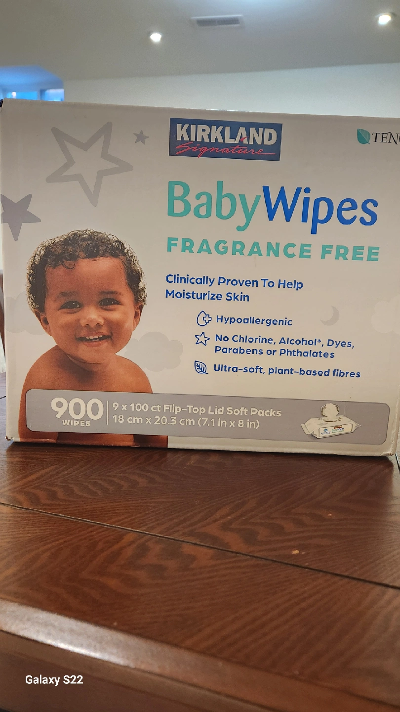 185I'm selling a box of Kirkland Signature Baby Wipes. This box contains 900 wipes, divided into 9 packs of 100 wipes each. They are fragrance-free and hypoallergenic, perfect for sensitive skin. They are also ultra-soft and made with plant-based fibres