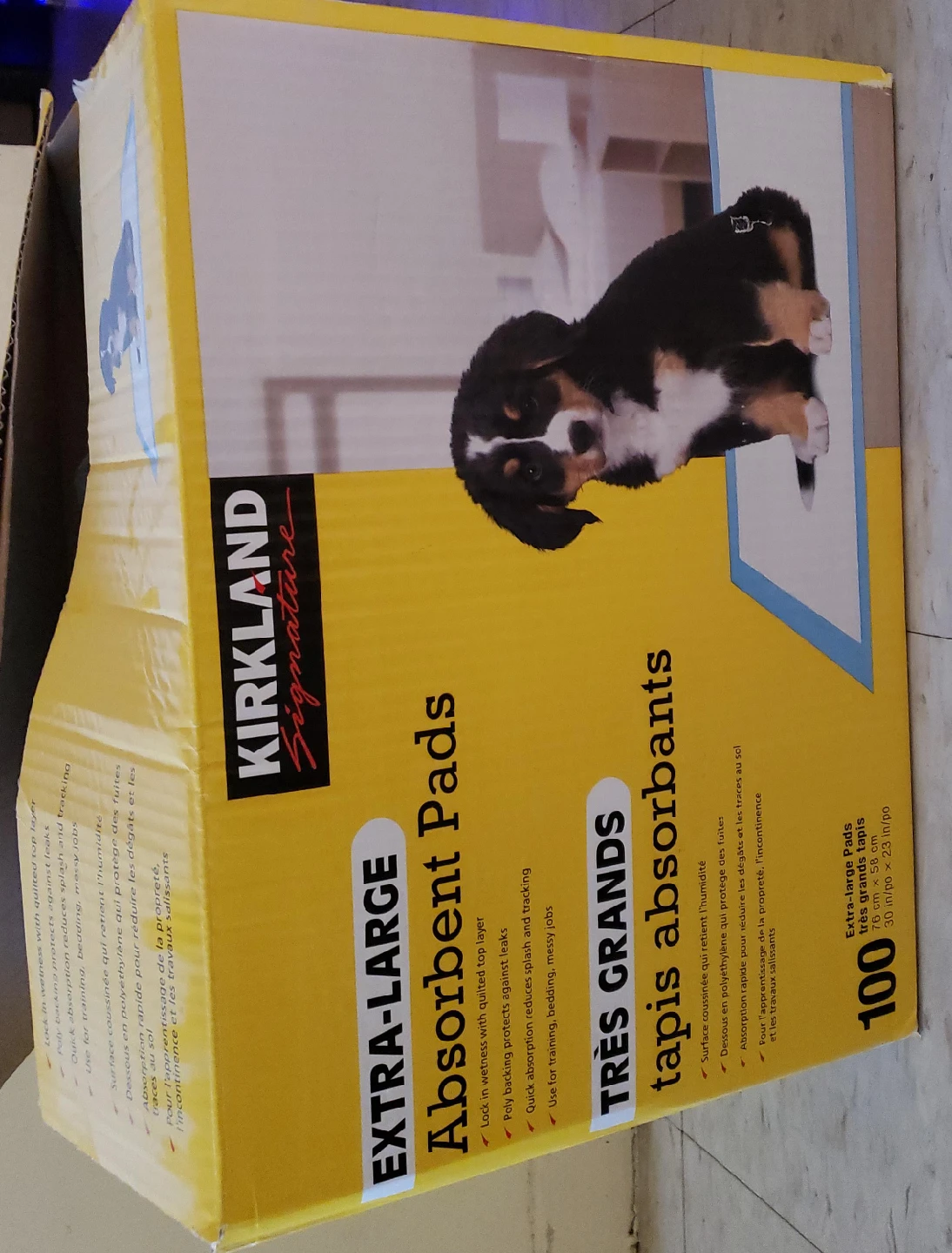 60Selling a box of Kirkland Signature Extra-Large Absorbent Pads. These are great for training, bedding, and messy jobs. They feature a quilted top layer to lock in wetness and poly backing to protect against leaks. Quick absorption reduces splash and tracking. Each pad measures 76 cm x 58 cm (30 in x 23 in).