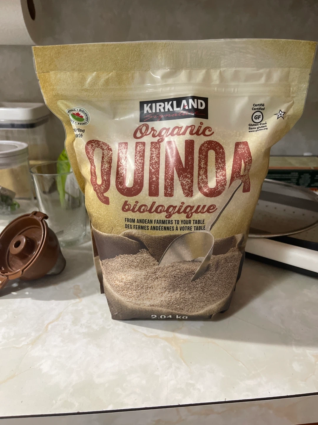 Selling a bag of Kirkland Signature Organic Quinoa! It's a 2.04 kg bag, perfect for stocking up your pantry. This quinoa is certified gluten-free and comes from Andean farmers. Enjoy this healthy and versatile grain in your favourite recipes