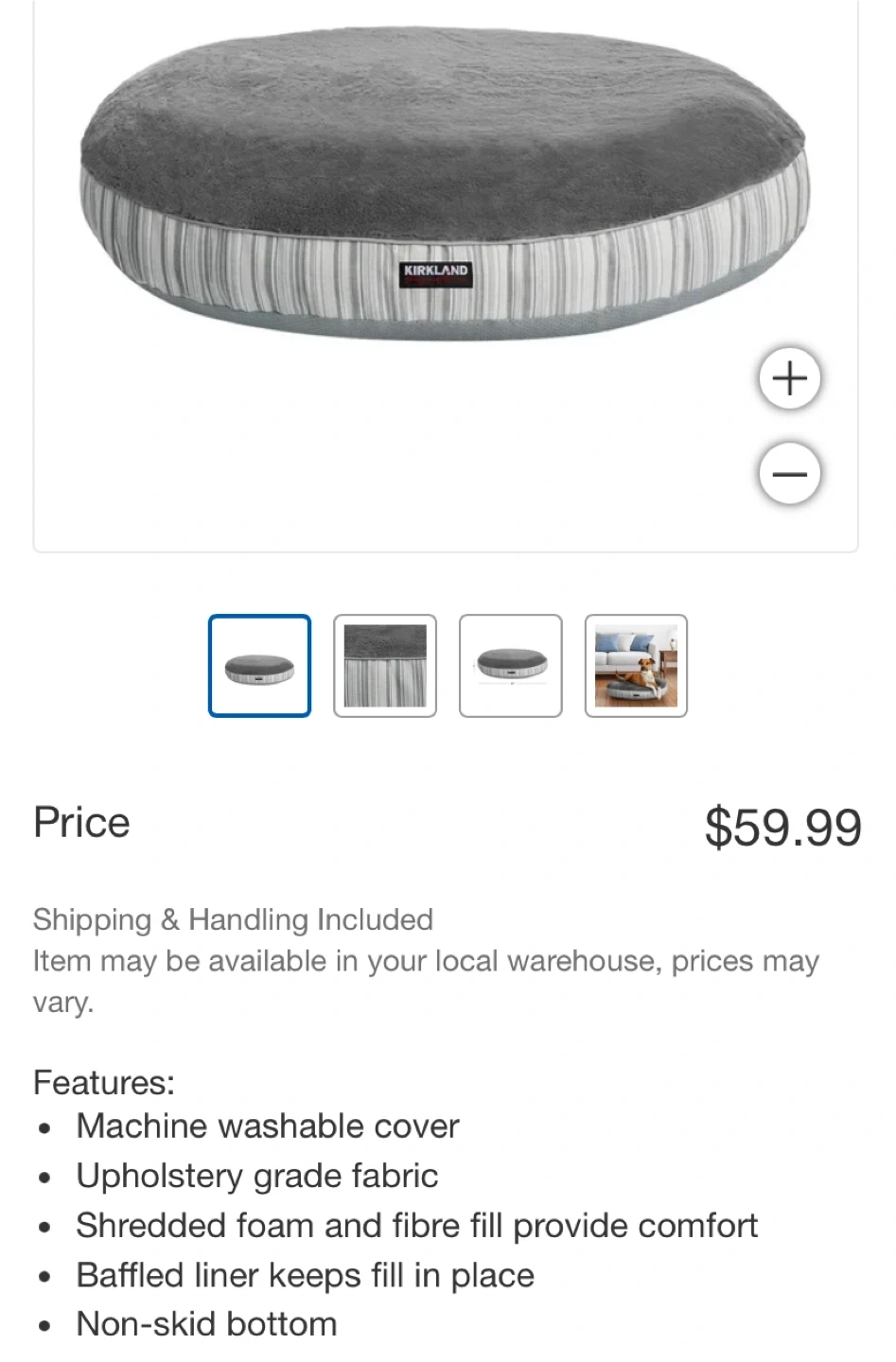 Selling a Kirkland Signature round pet bed - Machine washable cover - Upholstery grade fabric - Shredded foam and fibre fill provide comfort - Baffled liner keeps fill in place - Non-skid bottom Originally bought for $59.99 Plus free dog training tunnel (dogs love!)