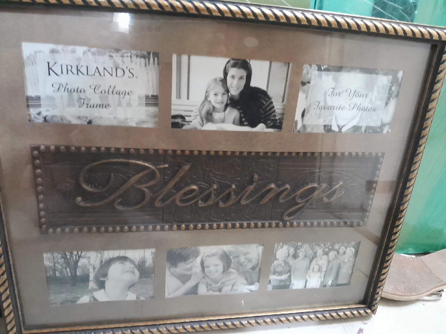 Selling a Kirkland's photo collage frame. It's perfect for displaying your favourite photos and memories. The frame features a decorative design with the word "Blessings" in the middle. It holds multiple photos in a collage style layout