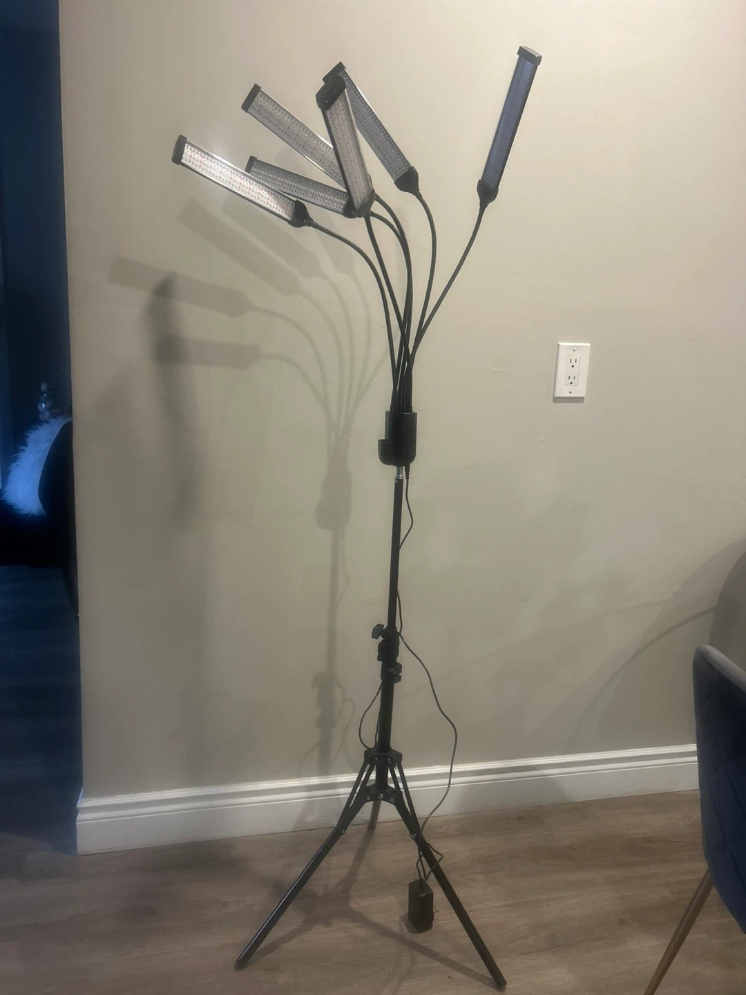 This LED ring light features 6 adjustable arms for optimal lighting. It includes a tripod stand for stability and comes with a power adapter. Perfect for content creators and makeup artists needing versatile, bright illumination!