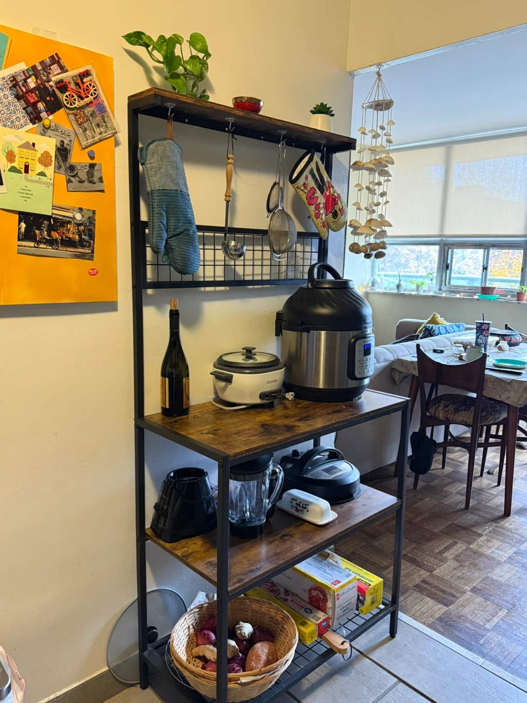 33It's in great condition and perfect for adding extra storage and workspace to your kitchen. It has multiple shelves and hooks for hanging utensils and cookware. A great addition to any kitchen!