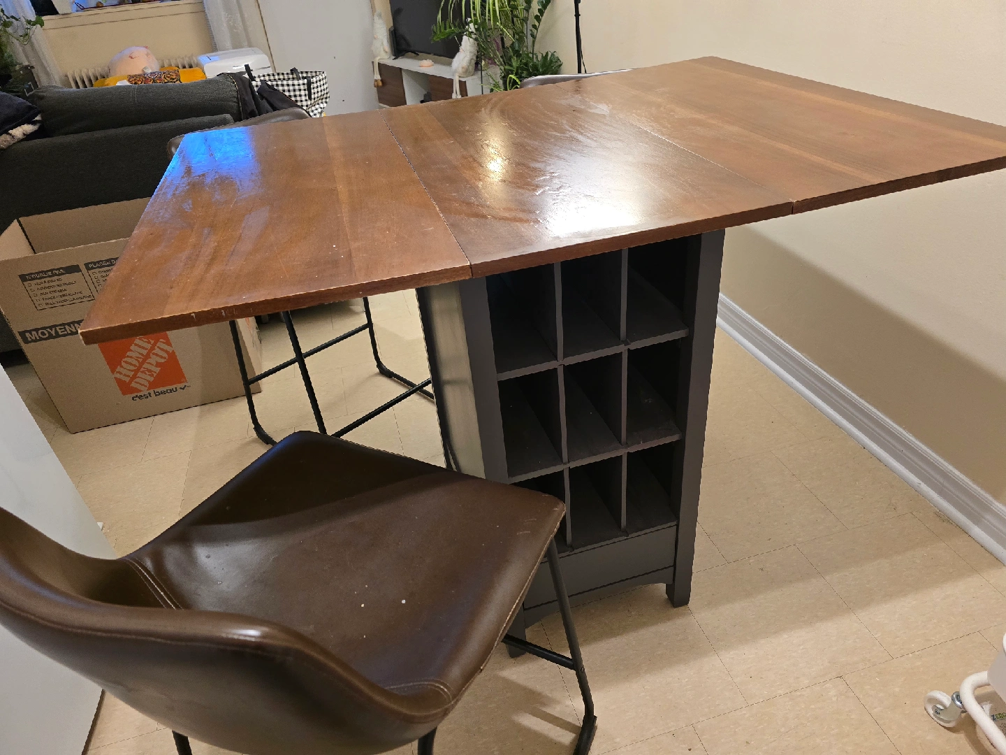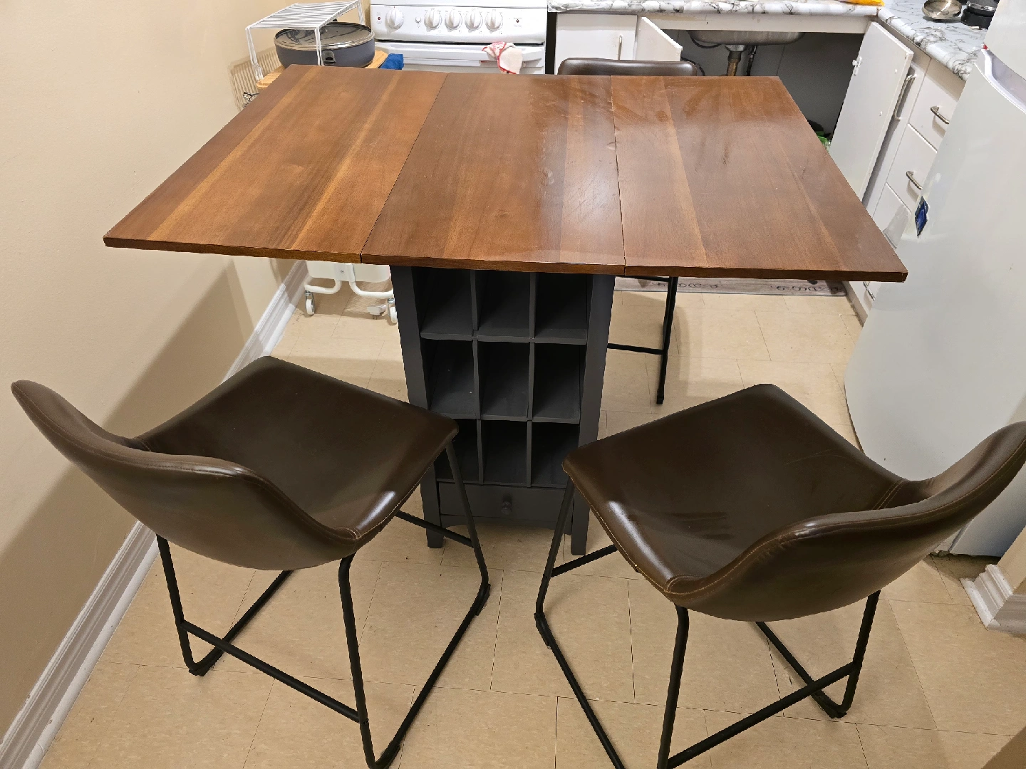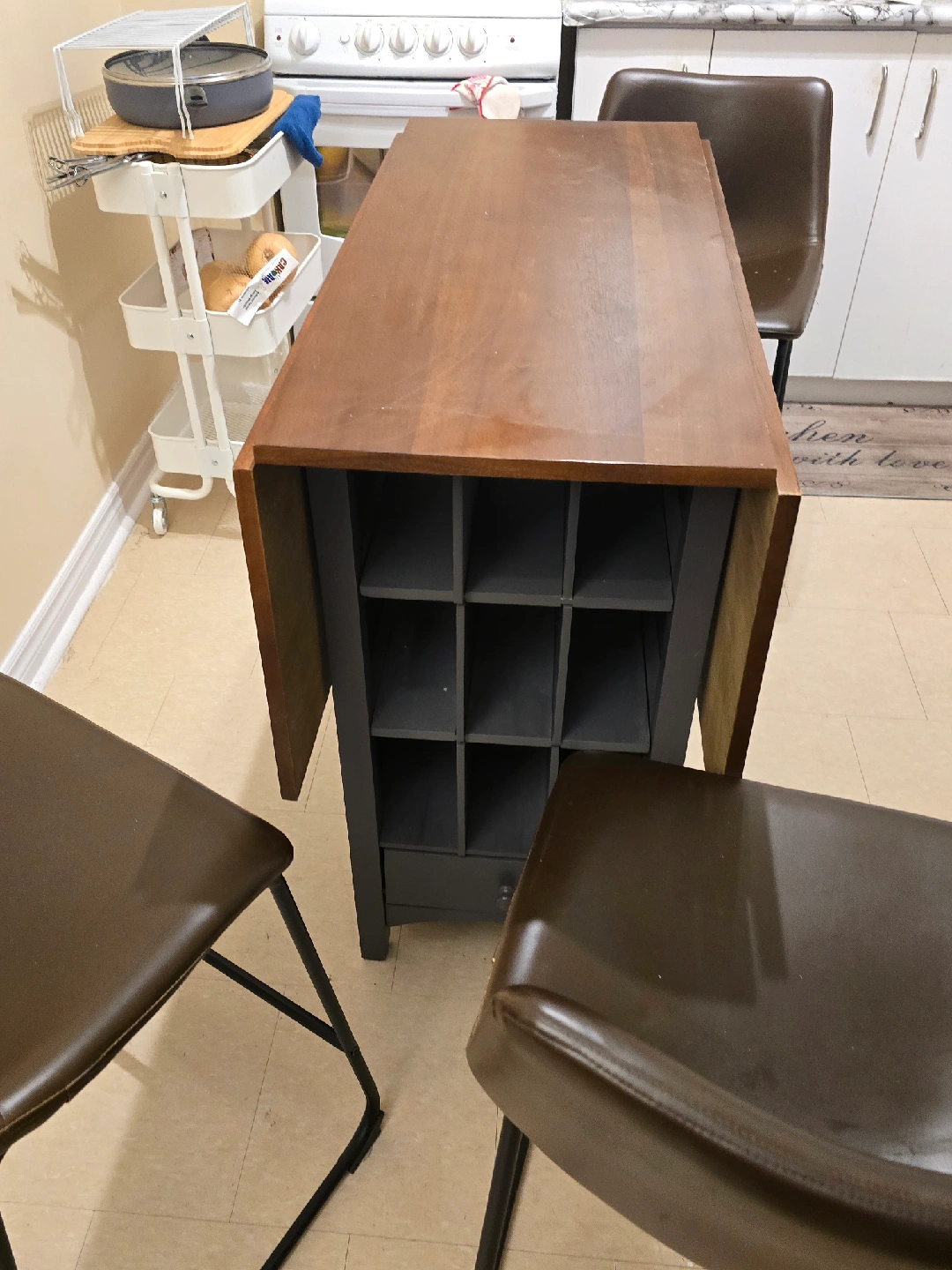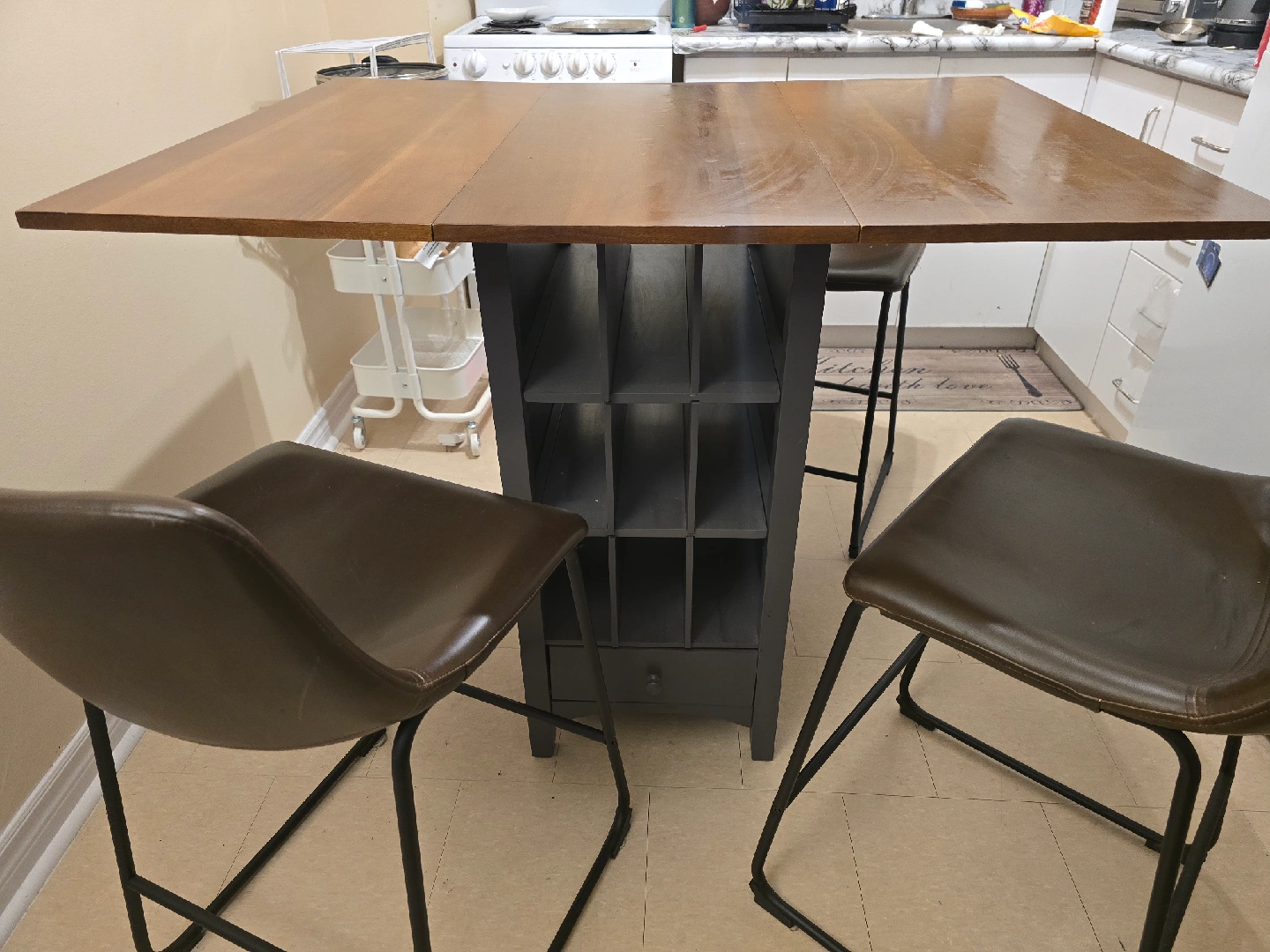 Selling a kitchen/bar table with a built-in wine rack and three matching chairs. The table has a wooden top and a grey base with shelving for wine storage. The chairs are a brown leather-like material with black metal legs. Great for a small dining area or kitchen!