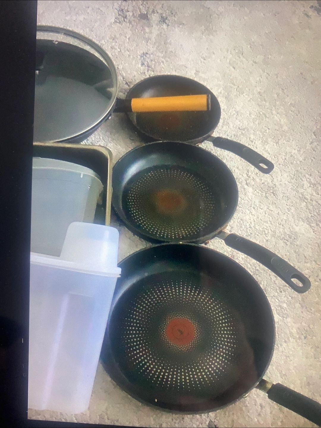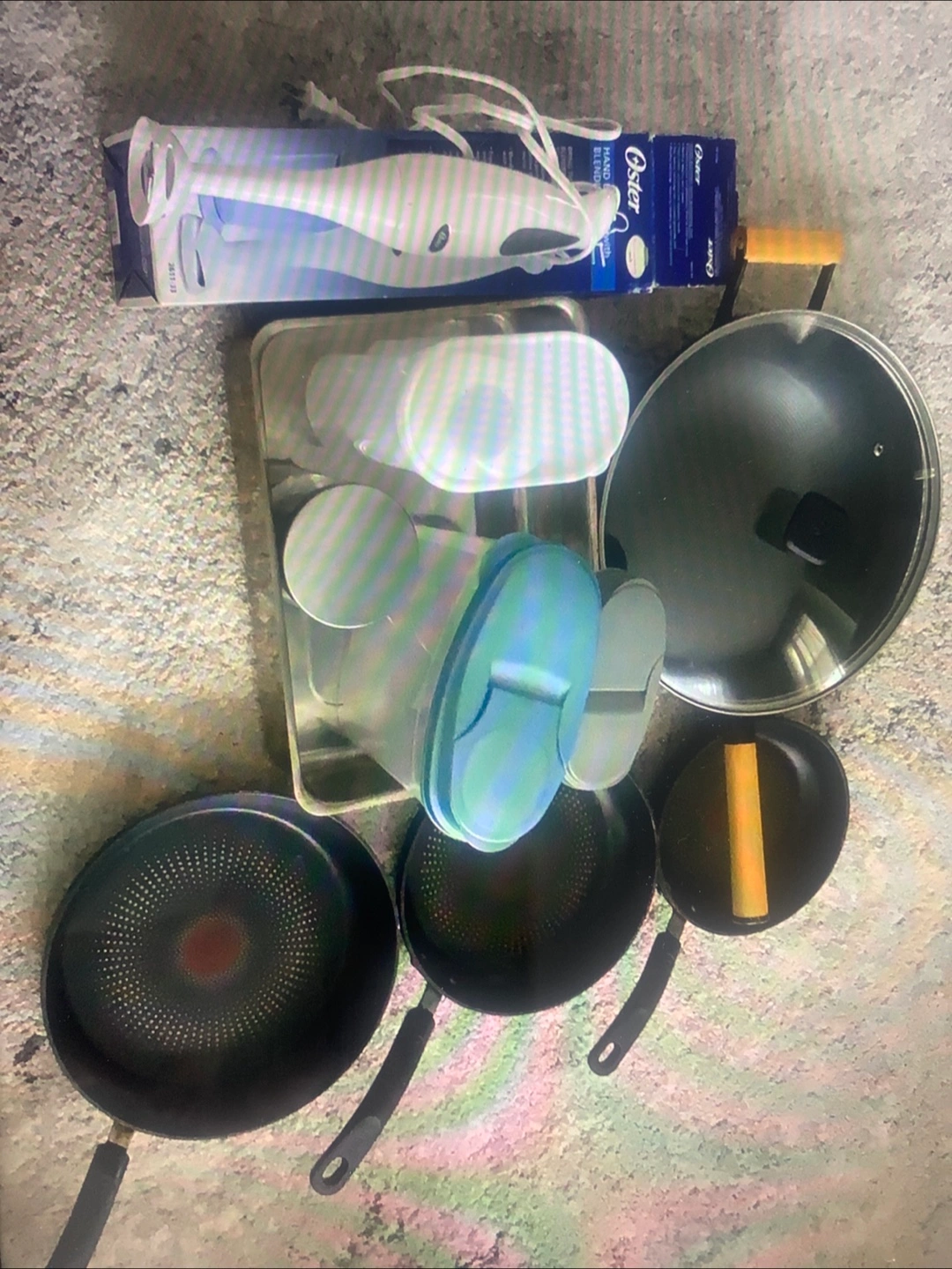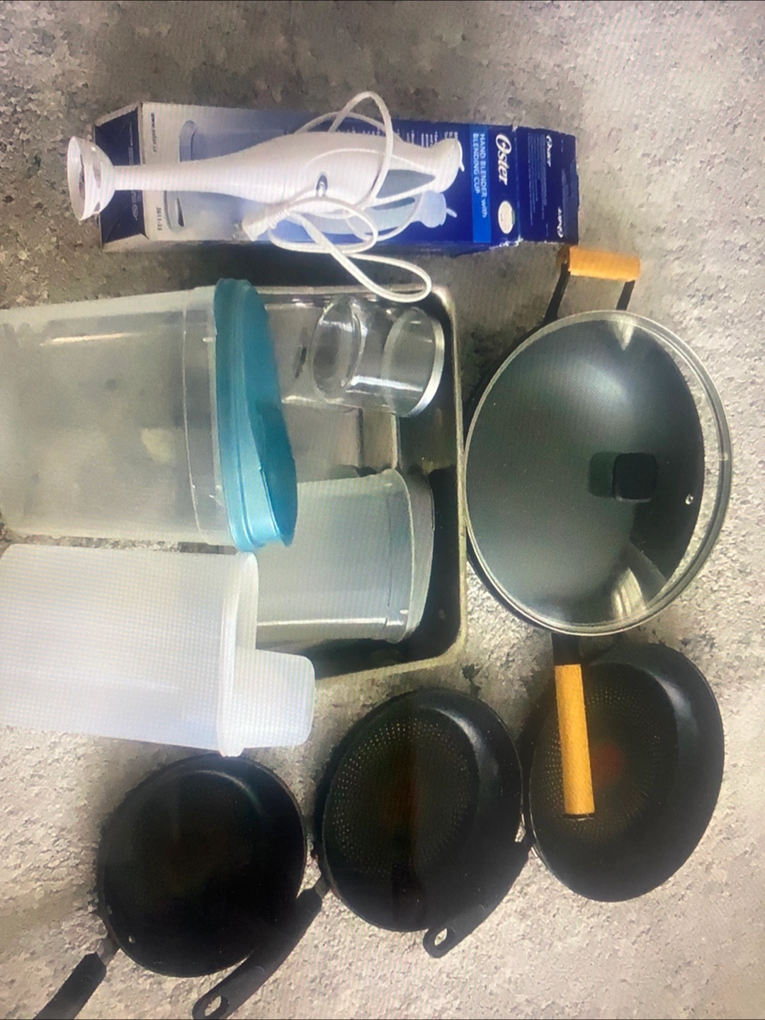 Grab this kitchen bundle! Includes an Oster hand blender, several pots and pans, and various plastic containers. Great for everyday cooking and storage. Pick up in Rocky Ridge