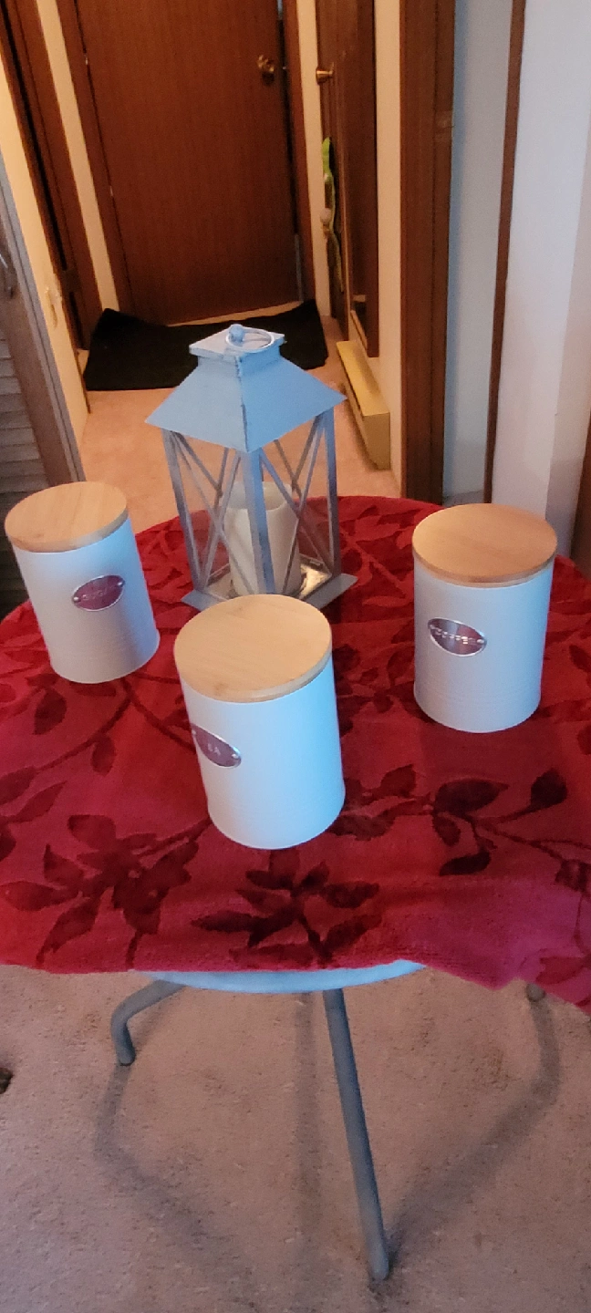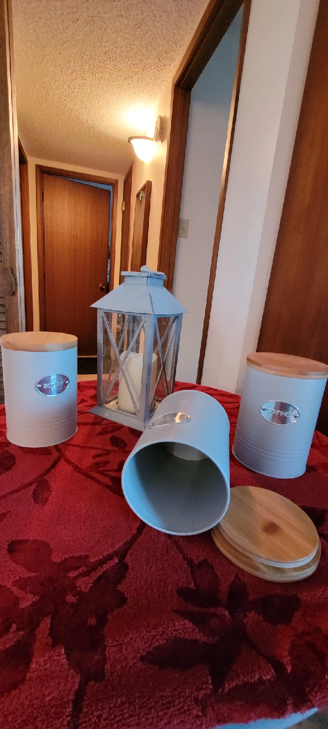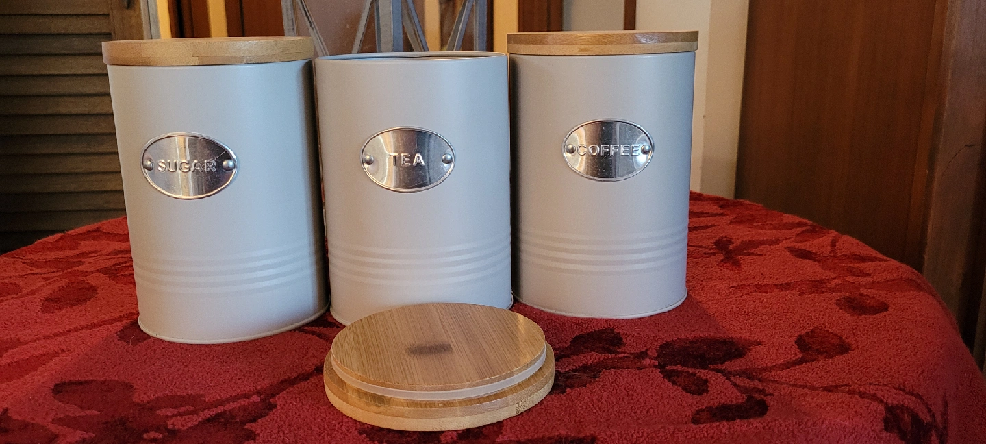 I'm selling a kitchen canister set that includes containers for sugar, tea, and coffee.