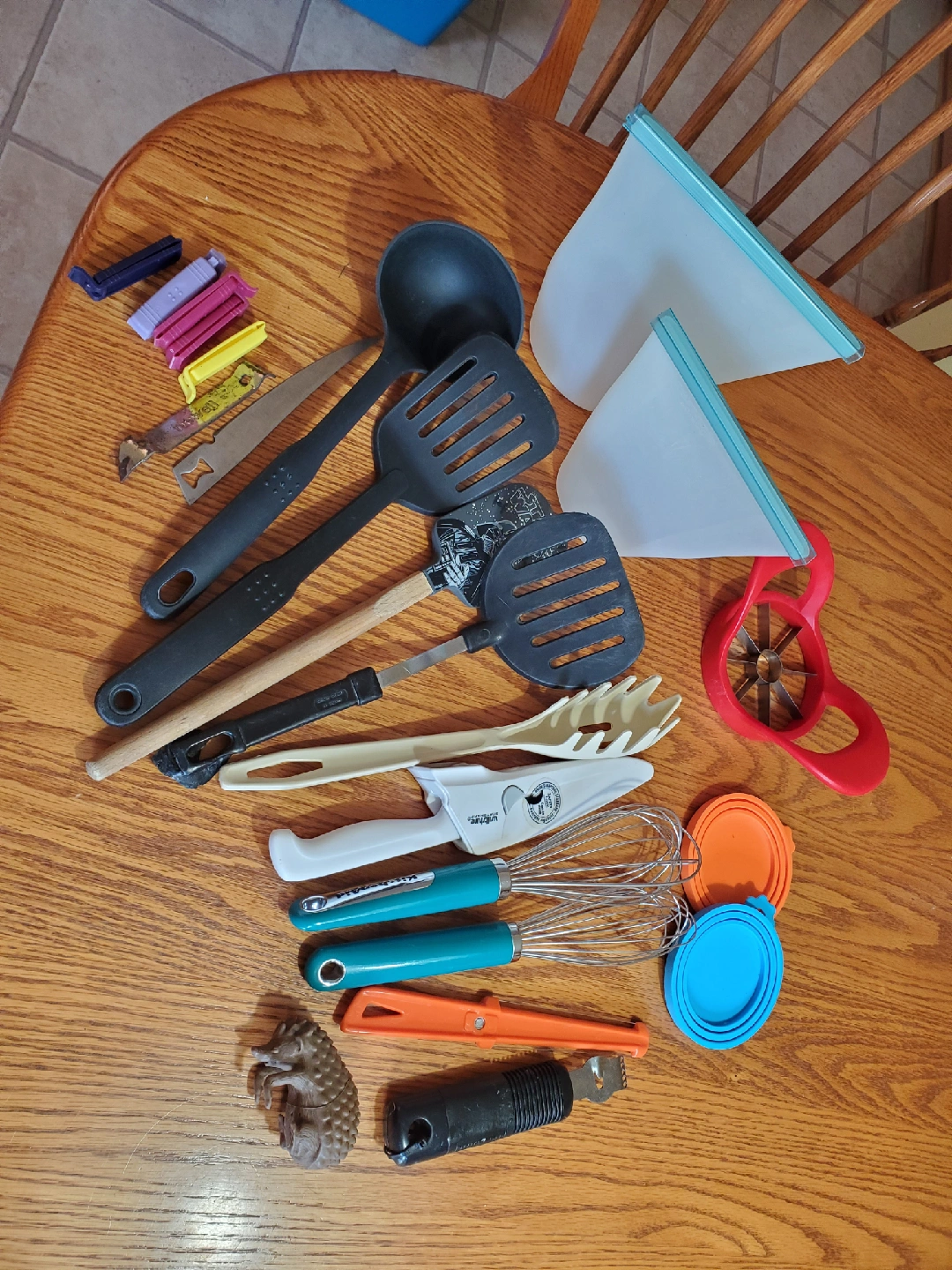 There's a variety of utensils including spatulas, ladles, whisks, loose tea holder, bpa storage bags, clips, etc smoke ftee