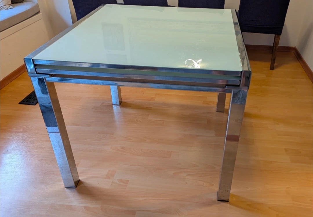 603Extendable Dining Table with Glass Top Selling a dining table with a stylish glass top and extendable feature! The frame is a shiny silver colour. Perfect for family dinners or entertaining guests, this table is both functional and chic Dimensions - 29.5 inches tall - 35.5 by 34.5 inches wide (square) - 71 inches when expanded