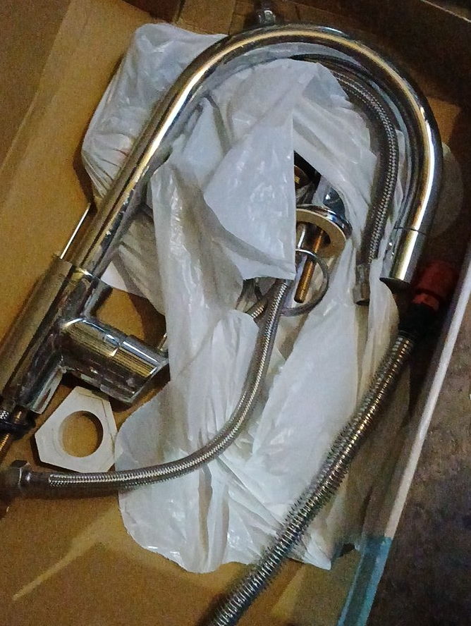 Selling a kitchen faucet that comes with all the necessary accessories for installation. It appears to be in good condition and ready for a new home!