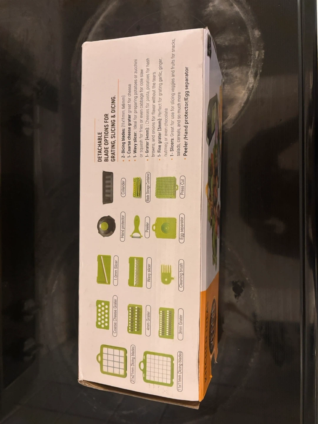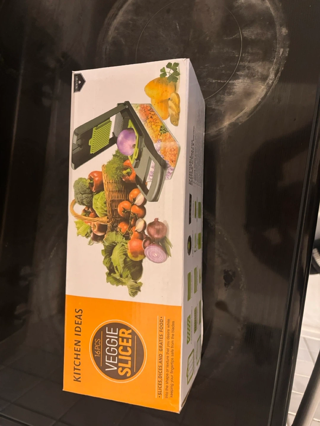 103This is a Kitchen Ideas 16-piece veggie slicer. It slices, dices, and grates food. It has detachable blade options for grating, slicing, and dicing. It also includes a peeler/hand protection egg separator