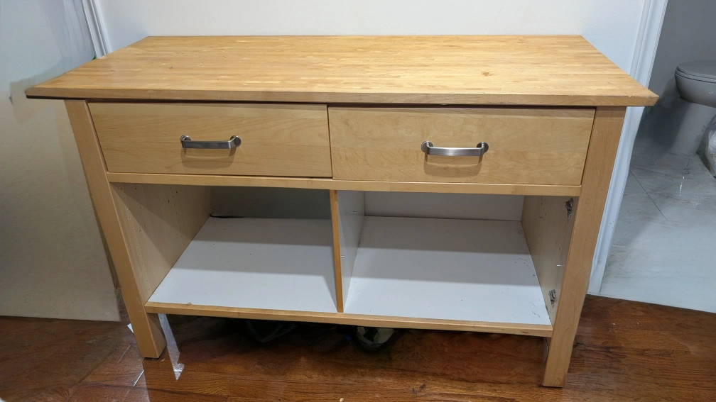 Kitchen island/storage with two drawers and empty shelf space underneath with the hardware to add shelves Solid wood Similar to previous Ikea varde models Did not select "like new" because the previous owners removed the doors to cover the bottom. Dimensions are: 57" wide x 25" deep x 35.5" high Bought for $350, selling for $150 or best offer