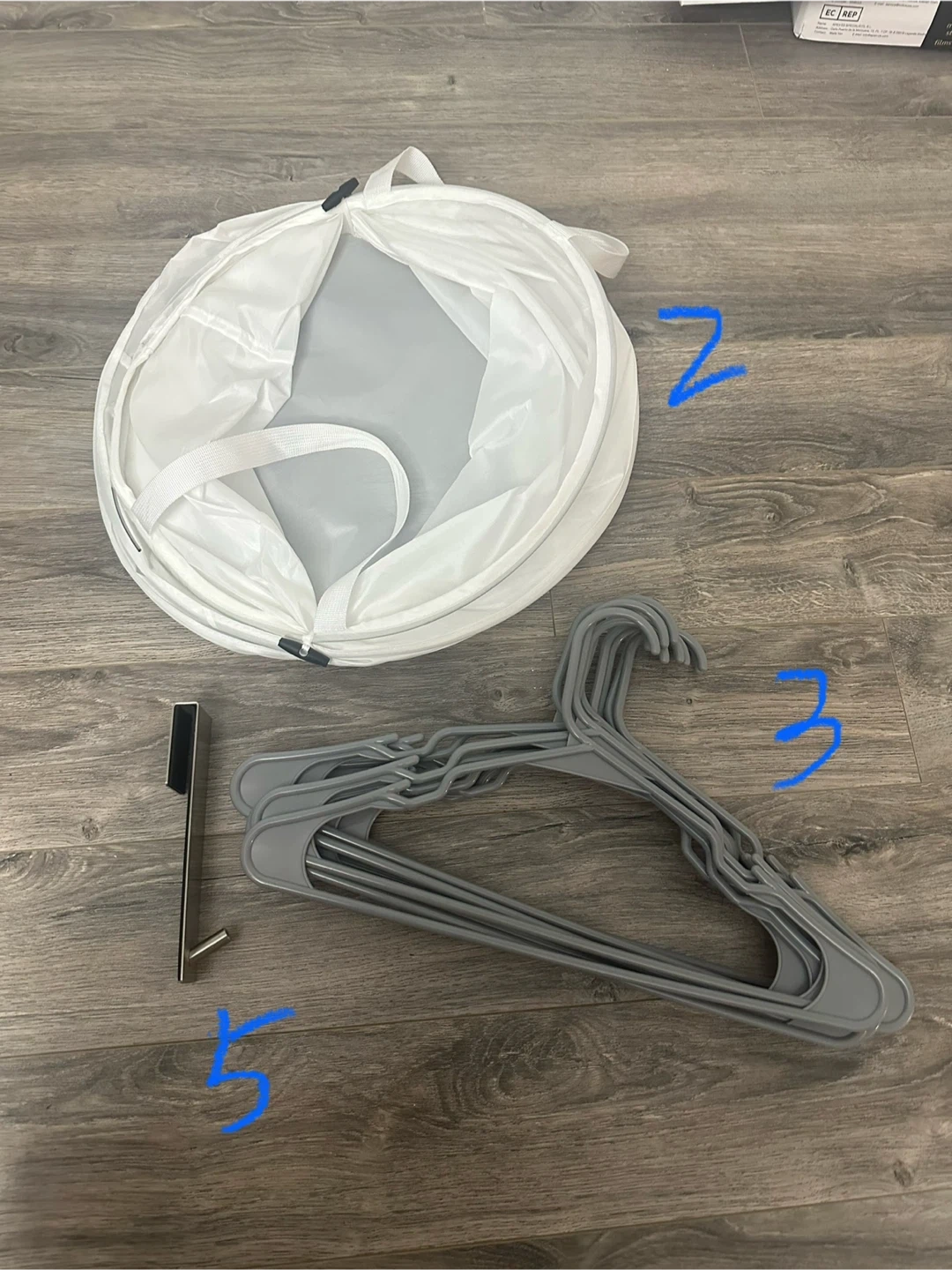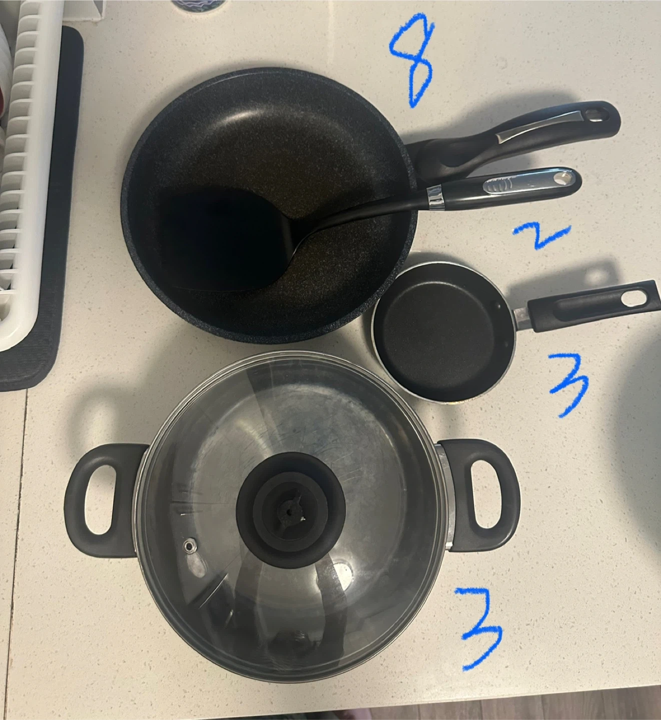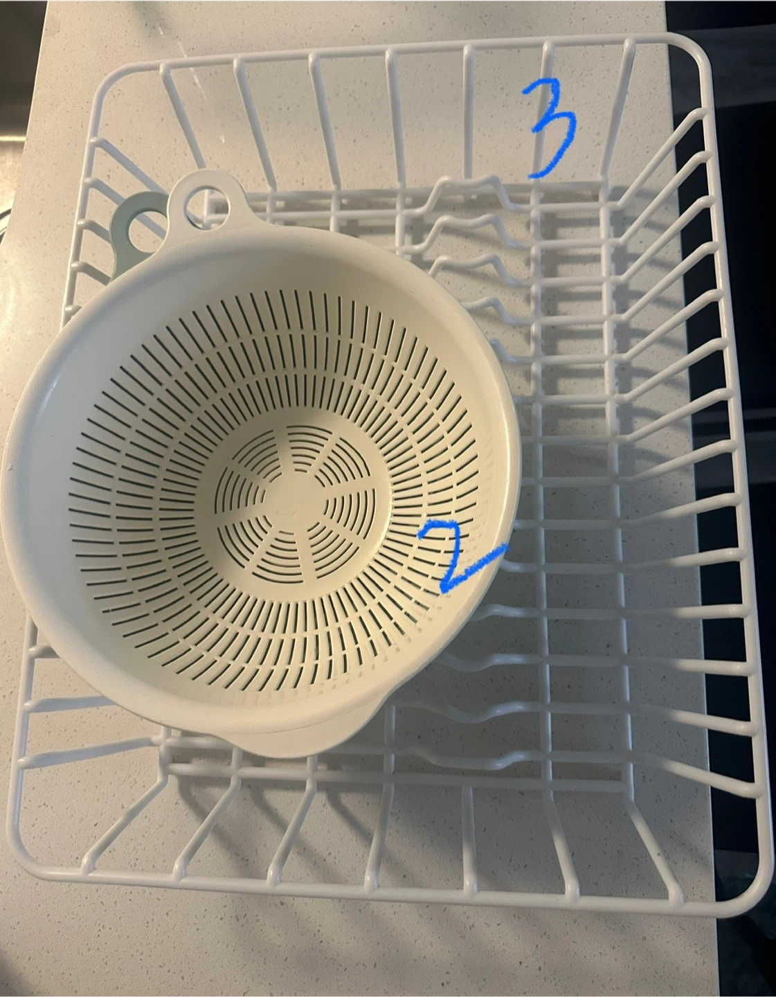 Selling a bundle of kitchen and household items! Includes a colander, frying pans, a pot with a lid, a dish rack, a laundry hamper, and some hangers. Great for someone setting up a new place!