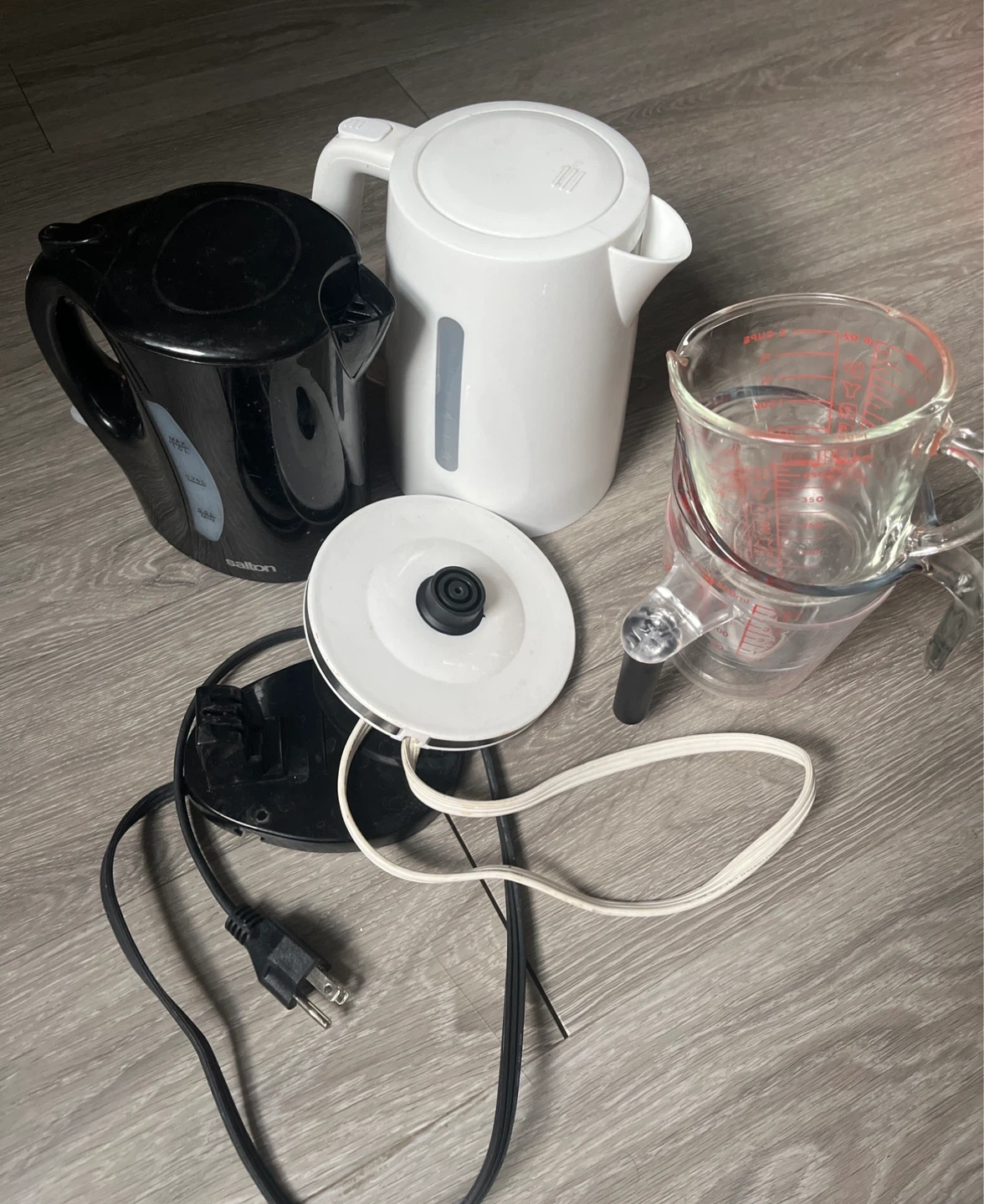 84Lot of kitchen items. - 2x kettle with plug-in attachment - 3x Measuring cup (2 glass, 1 plastic.)