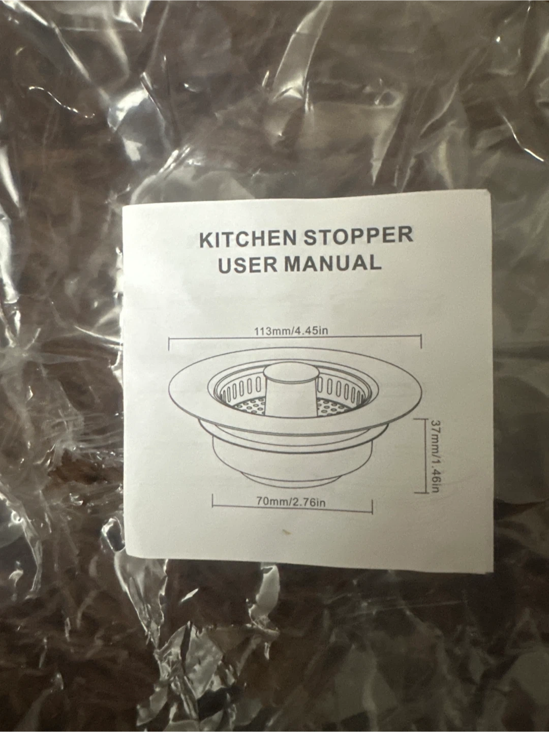 Selling a brand new kitchen sink stopper! It comes with the user manual. The stopper's dimensions are approximately 113mm (4.45in) in diameter, 70mm (2.76in) at the base, and 37mm (1.46in) in height