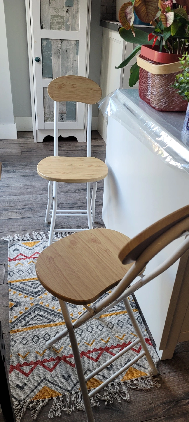 28Selling two kitchen stools! They are foldable, making them easy to store when not in use. The seats are a light wood colour with white metal frames. Great for small spaces or extra seating when needed! It is NOT a bar stool, just a regular chair height. Price per stool. legs height 16" depth 9"